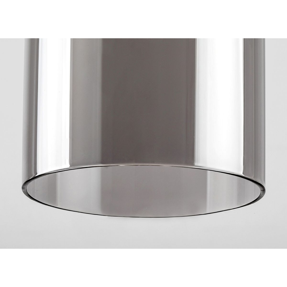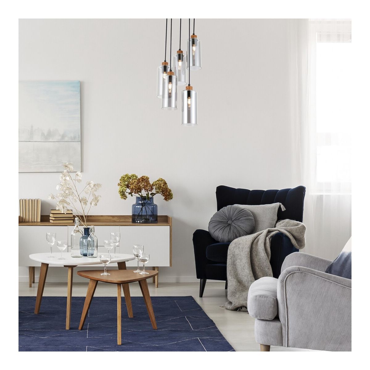 - Die aus Metall gefertigte Leuchte wird durch Textilkabel und zylindrische Lampenschirme ergänzt, wobei die fünf Leuchtenköpfe in unterschiedlichen Höhen aufgehängt sind