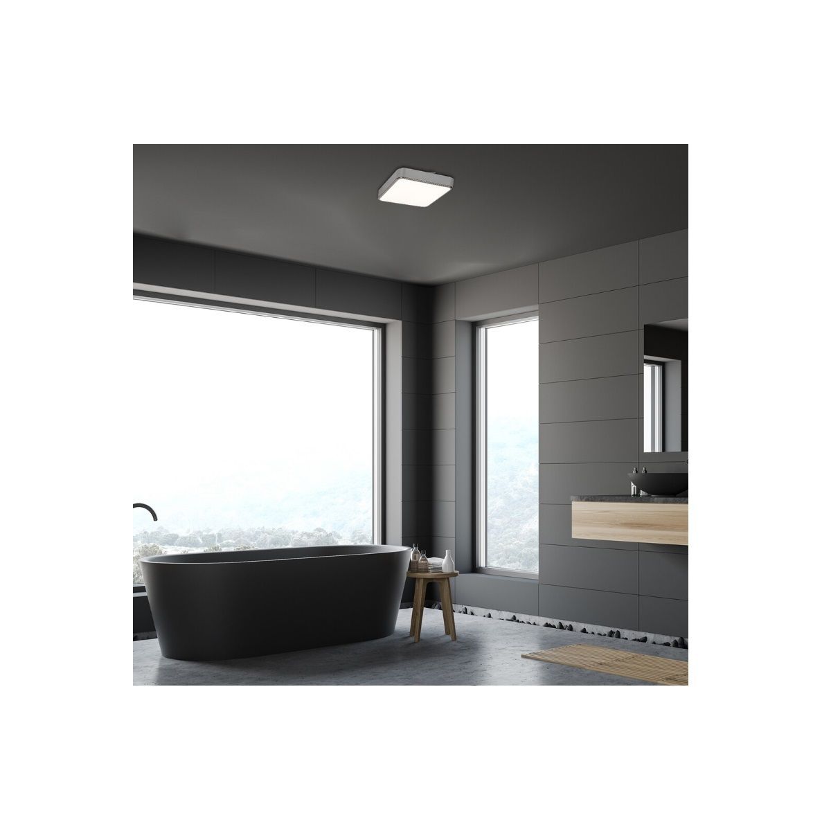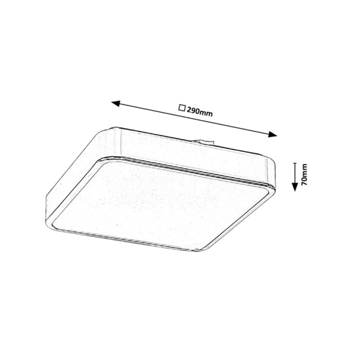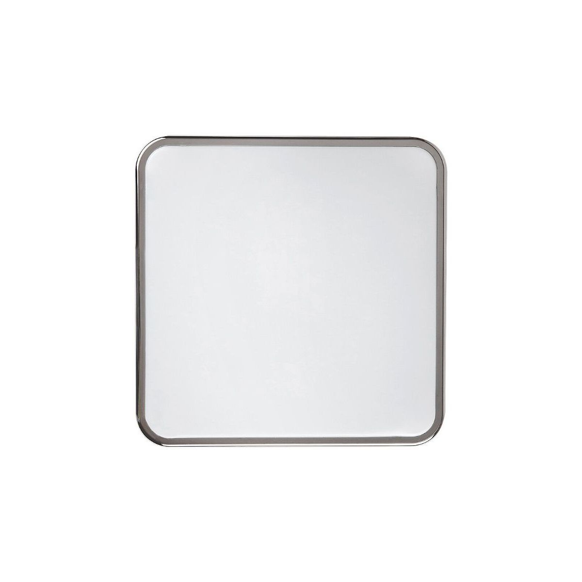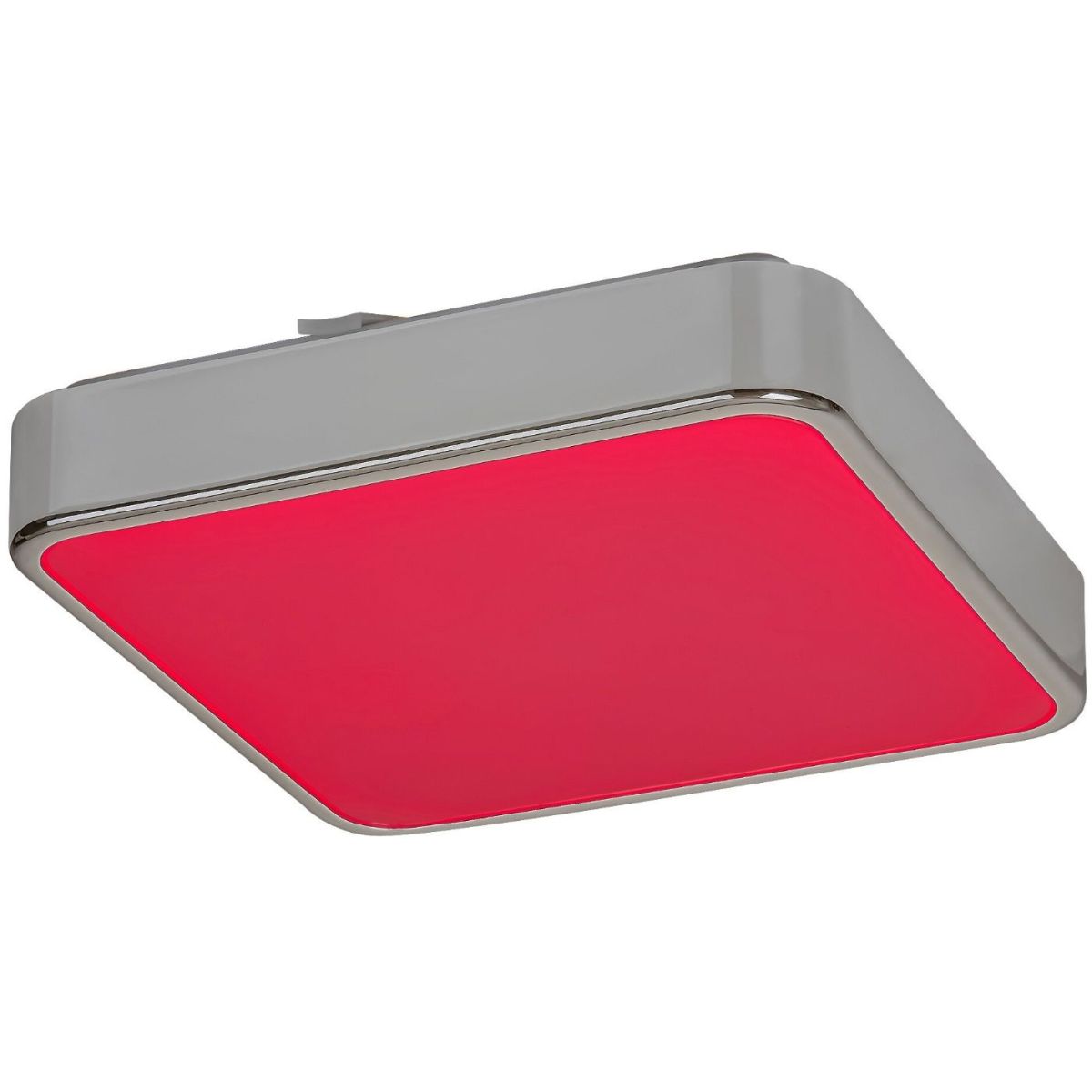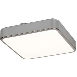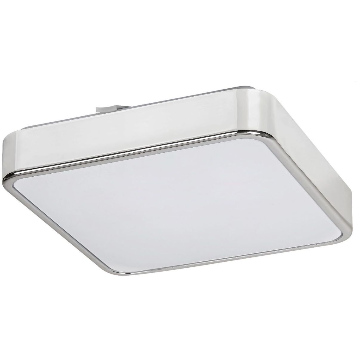 Die quadratische Form der Lampe Wolimir, bestehend aus einem verchromten Metallrahmen und einem weißen Acryldiffusor, wird durch abgerundete Ecken gemildert.