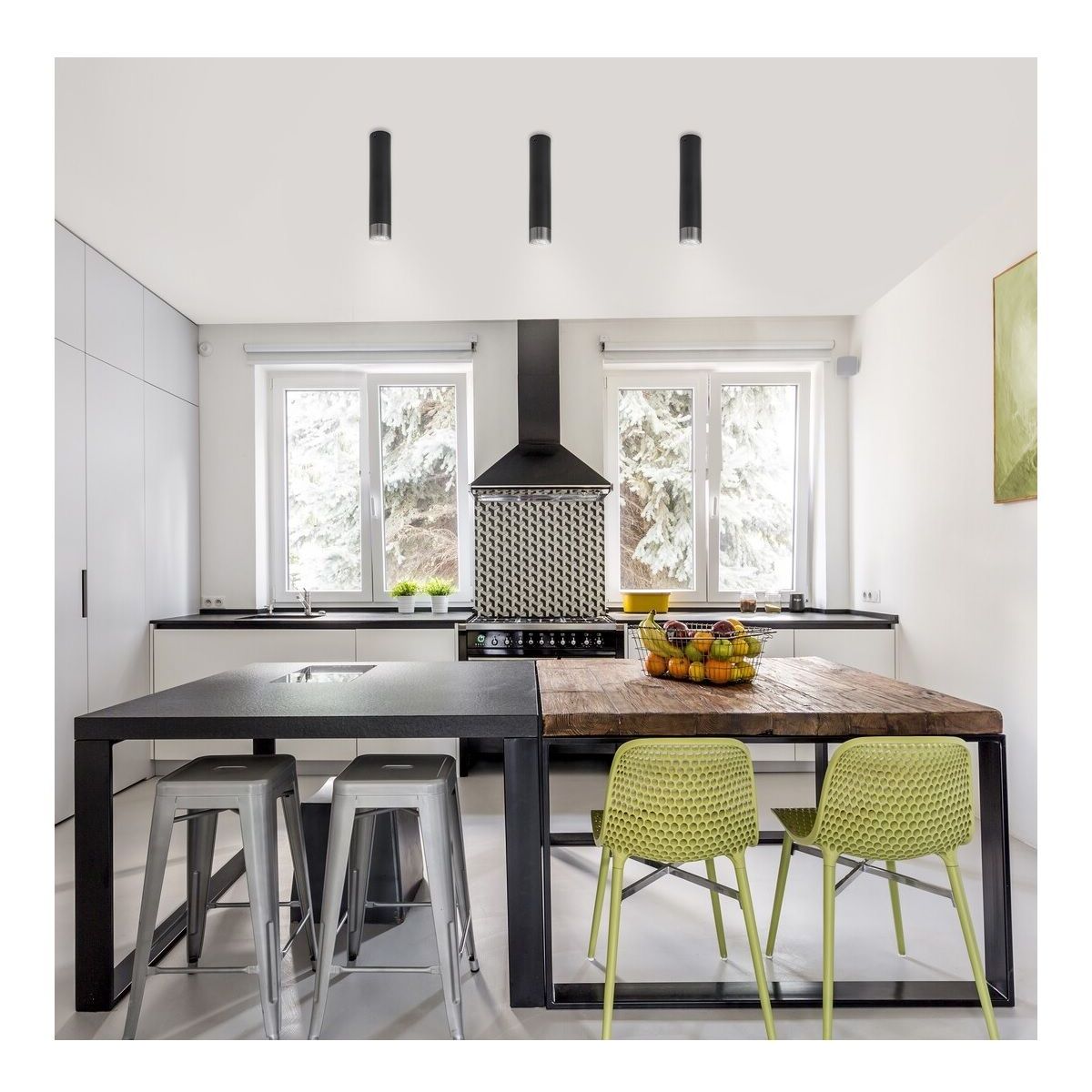 Mit ihrem minimalistischen Design wird die Deckenleuchte Zircon zu einem charakteristischen Element Ihrer modernen Wohn-, Ess- oder Küche. Dieses vollständig aus Metall gefertigte Modell besteht aus einem schwarzen Rahmen und einem silbernen Lampenschirm. Diese schlanke, zylindrische Leuchte kann mit einer einzelnen Glühbirne mit einer Leistung von bis zu 5 W verwendet werden. Der Sockeltyp ist GU10. Wenn Sie einen modernen, hellen Effekt erzielen möchten, wählen Sie für diese Lampe eine Glühbirne mit natürlichem weißem Licht. Wenn Sie jedoch eine intime, gemütliche Atmosphäre schaffen möchten, verwenden Sie eine Glühbirne mit warmweißem Licht. Die Abmessungen der Deckenleuchte Zircon sind wie folgt: Höhe 27 cm, Durchmesser 5,2 cm. Dieses Modell wird ohne Leuchtmittel geliefert.