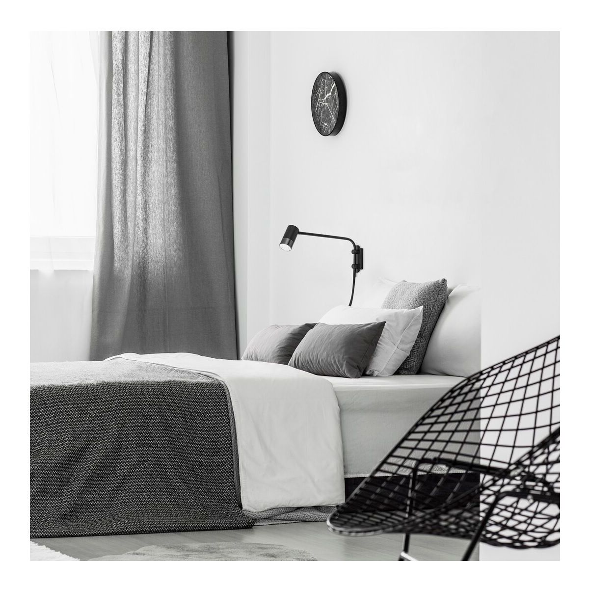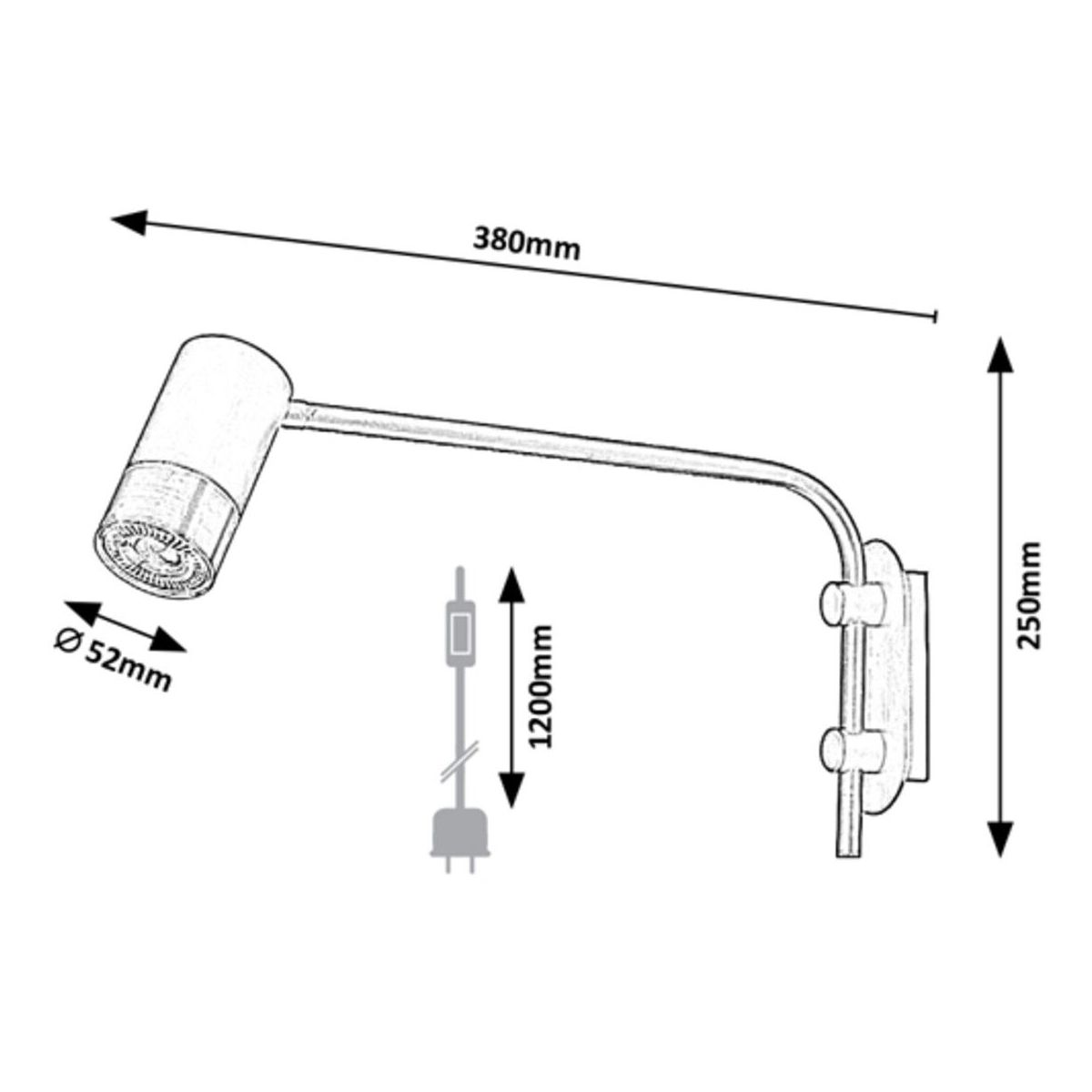 Die Wandleuchte Zircon mit ihrem minimalistischen Design ist ein praktisches Element für Ihr modernes Wohn- oder Schlafzimmer. Dieses vollständig aus Metall gefertigte Modell besteht aus einem schwarzen Rahmen und einem silbernen Lampenschirm. Die Leuchte kann mit einem länglichen, abgerundeten, dekorativen Sockel an der Wand befestigt werden. Diese zylindrische Leuchte kann mit einer einzelnen Glühbirne mit einer Leistung von bis zu 5 W verwendet werden. Der Sockeltyp ist GU10. Wenn Sie eine gemütliche, intime Atmosphäre schaffen möchten, wählen Sie für diese Leuchte eine Glühbirne, die warmes, weißes Licht ausstrahlt. Sowohl der Arm als auch der weitreichende Lampenkopf sind beweglich, sodass Sie das Licht nach Belieben ausrichten können. Die Abmessungen dieses Modells, das mit einem Kabelschalter ausgestattet ist, betragen: Breite 6 cm, Höhe 25 cm, Durchmesser des Lampenschirms 5,2 cm, Abstand zur Wand 38 cm. Die Länge des Textilkabels beträgt 120 cm. Dieses Modell wird ohne Leuchtmittel geliefert.
