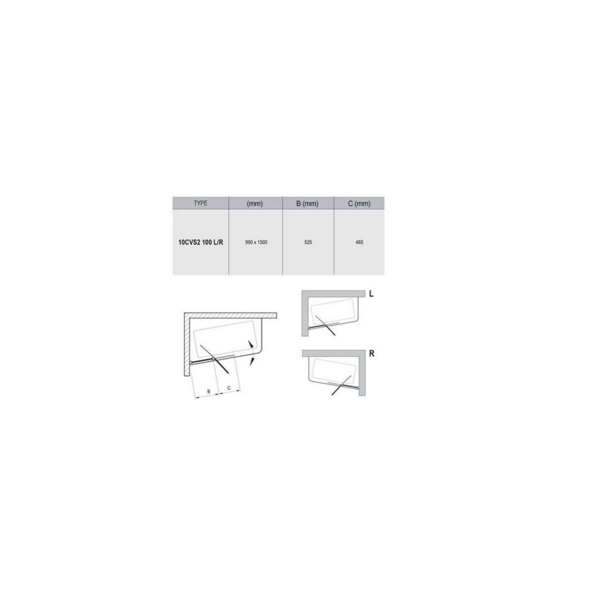 Zweiteiliger, beweglicher Badewannenaufsatz für Eckbadewannen 10°. Ausführung in glänzendem Chrom mit Füllung aus transparentem Glas mit Schutzschicht Ravak AntiCalc®. Variante links.