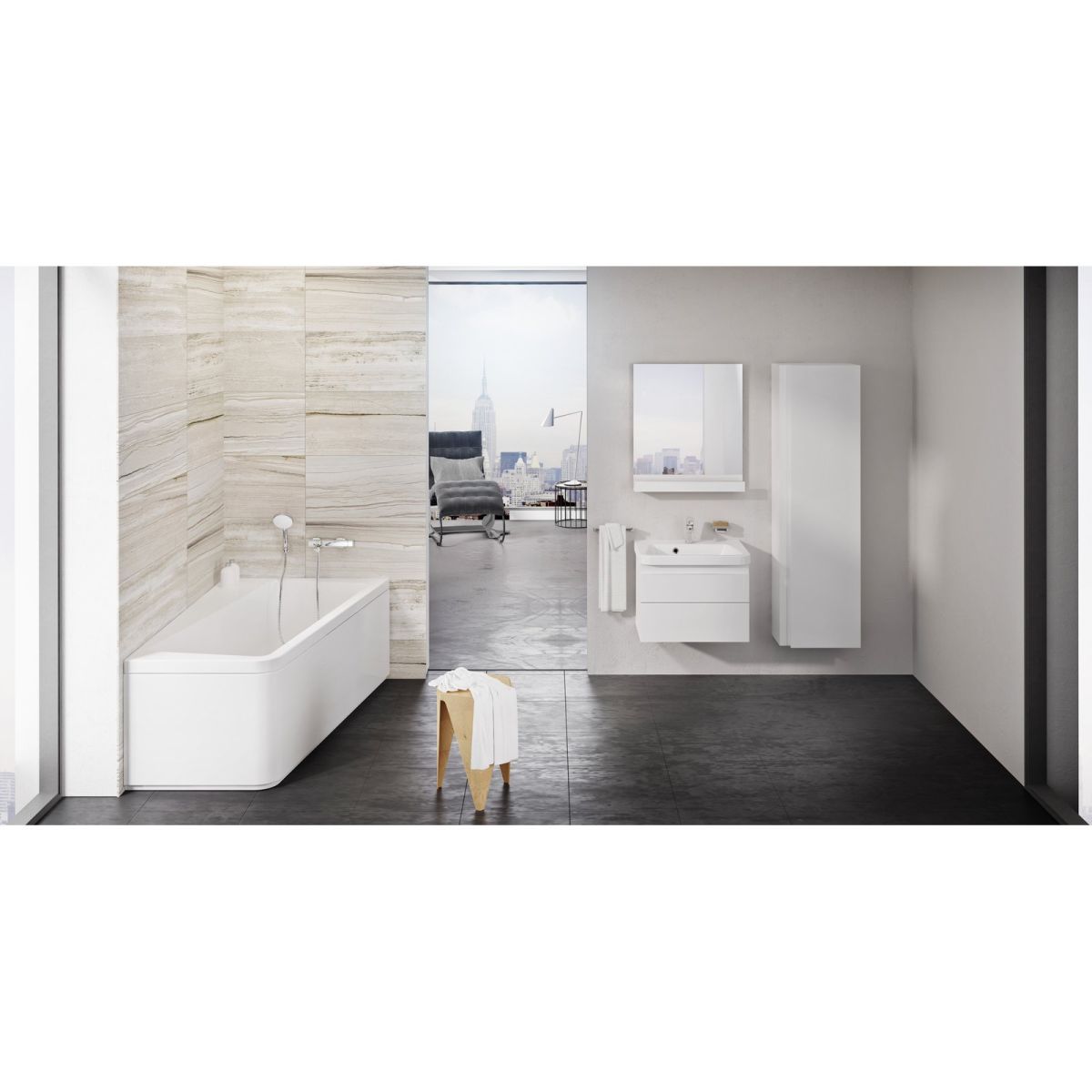 Die asymmetrische Badewanne 10° vereint den Komfort einer Badewanne mit der Praktikabilität einer Duschkabine. Durch den Abstand zur Wand entsteht ein Raum, der als Sitzfläche für ein bequemes Duschen oder zur Aufbewahrung von Kosmetika genutzt werden kann. Rechte Variante.