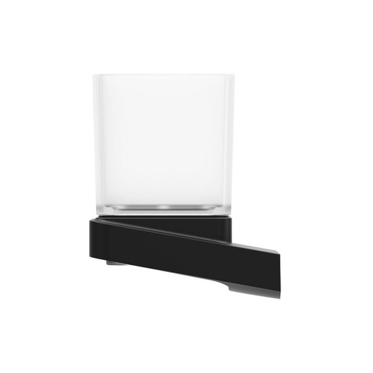 Der schwarze Halter mit Glasbecher im 10°-Design kann beispielsweise für Zahnbürsten, Zahnpasta oder andere kleine Gegenstände verwendet werden, die griffbereit sein müssen. Der Kontrast zwischen mattem Schwarz und milchigem Glas schafft eine einzigartige Kombination stilvoller Accessoires für das moderne Badezimmer.