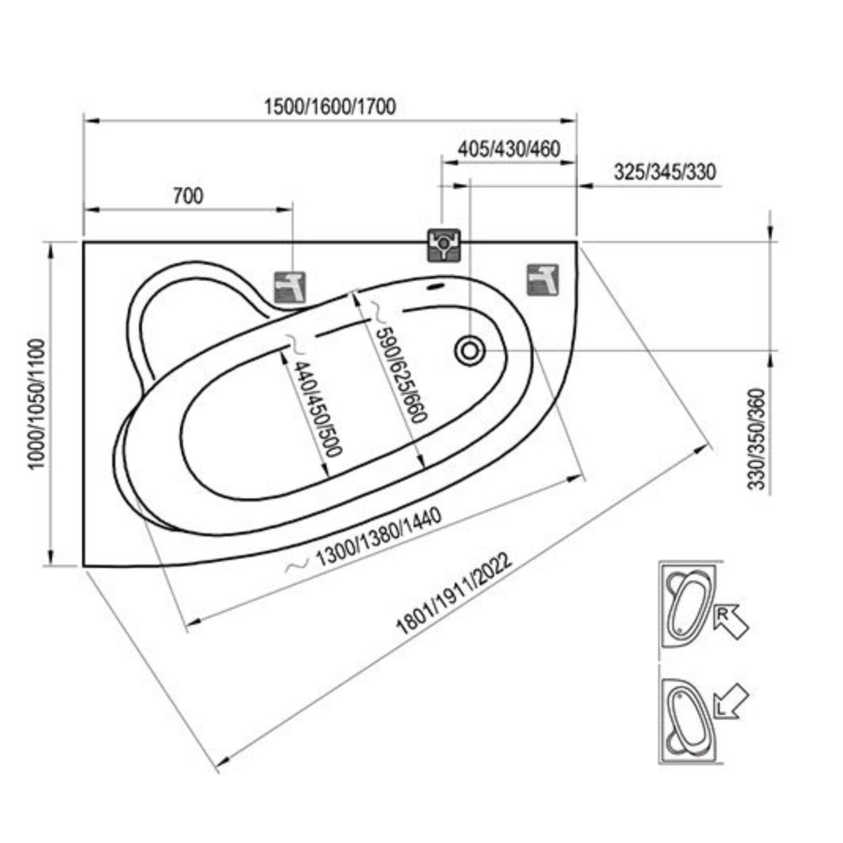 Die technische Zeichnung zeigt die linke Version der Badewanne. Die Preise gelten für die rechte Badewanne.