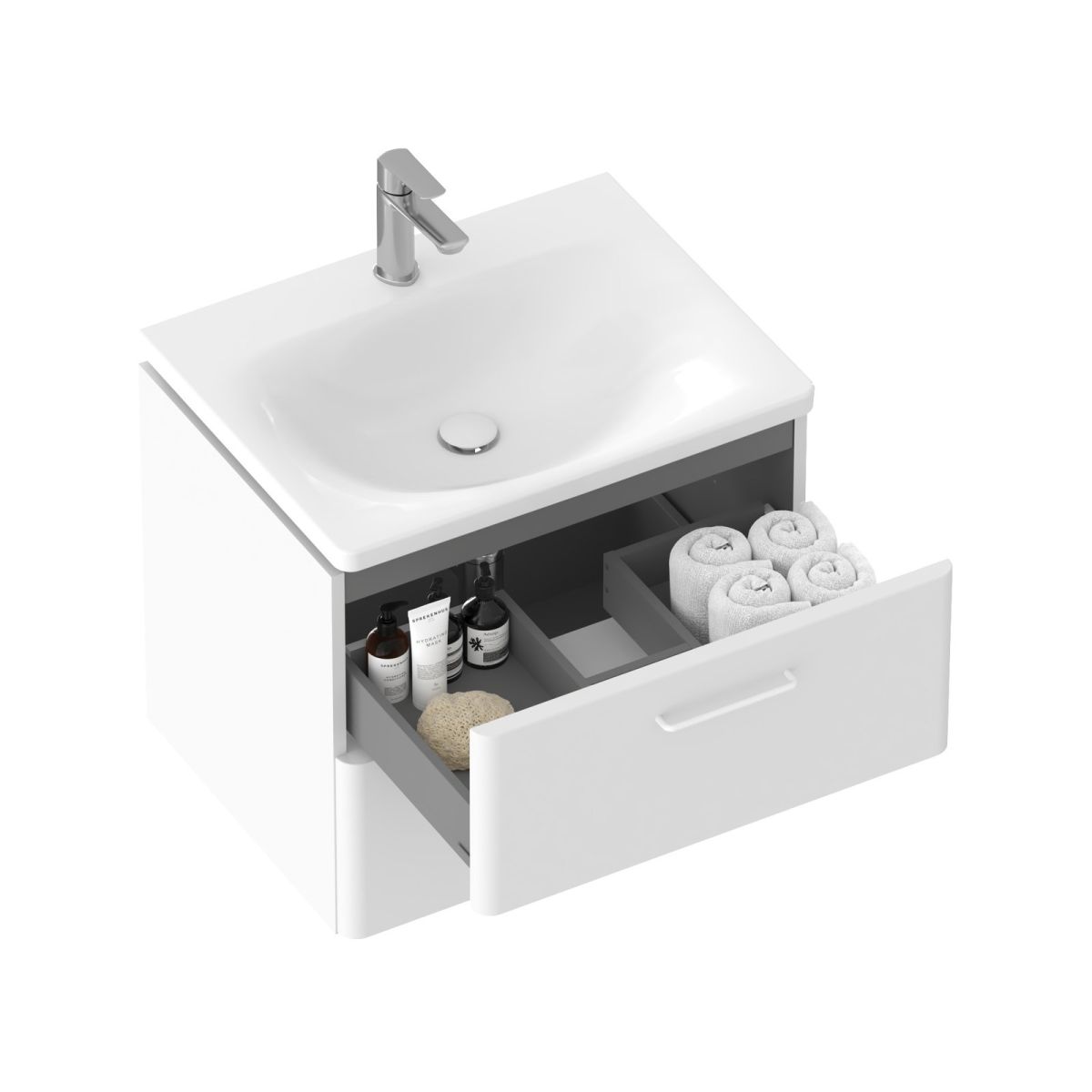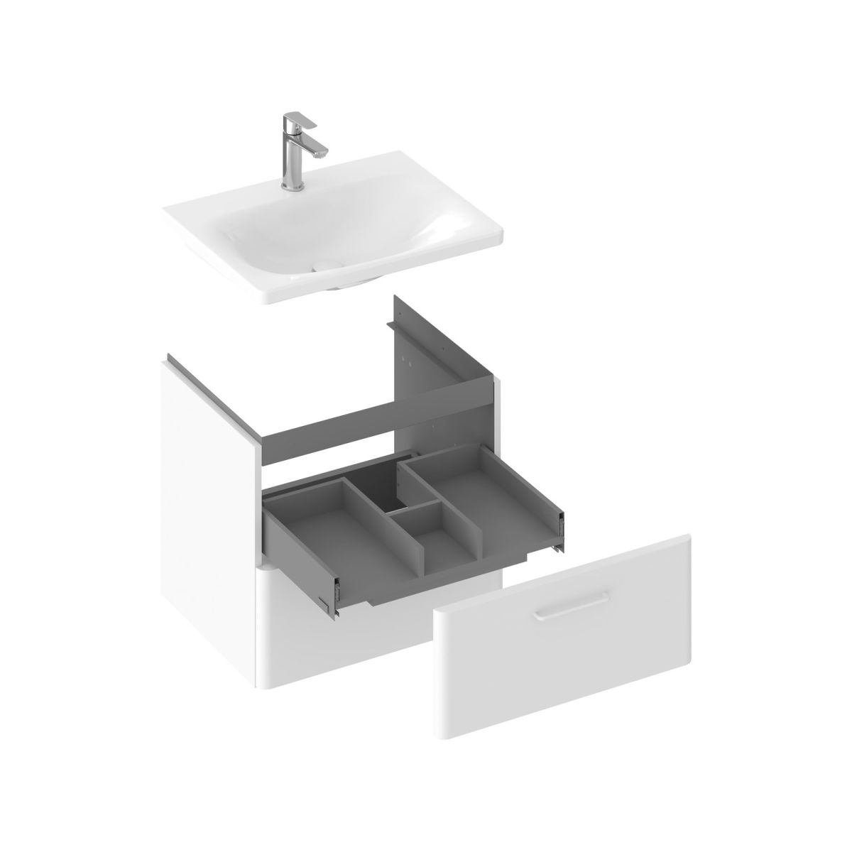 Das Innere des Schranks ist graphitfarben. Zwei Schubladen mit Soft-Close-System bieten viel Stauraum. Der Schrank hat Bohrungen für Griffe, die nicht im Lieferumfang enthalten sind und separat erworben werden müssen (2 Stück). Es stehen drei Farben zur Auswahl: glänzendes Chrom, Schwarz oder Weiß. Der Schrank ist für das Waschbecken Balance 60 ohne Überlauf vorgesehen. Der Schrank kann auch mit der Arbeitsplatte Balance 60/120 in Weiß, den Konsolen für die Arbeitsplatte Balance/Comfort 120, dem weißen Handtuchhalter Balance II und einem Aufsatzwaschbecken (z. B. aus der Serie Uni / Uni Slim) kombiniert werden. Der Schrank wird zusammen mit einem Montageset (Schrauben, Scharniere, Abdeckkappen) geliefert. Für die Wandmontage vorgesehen.