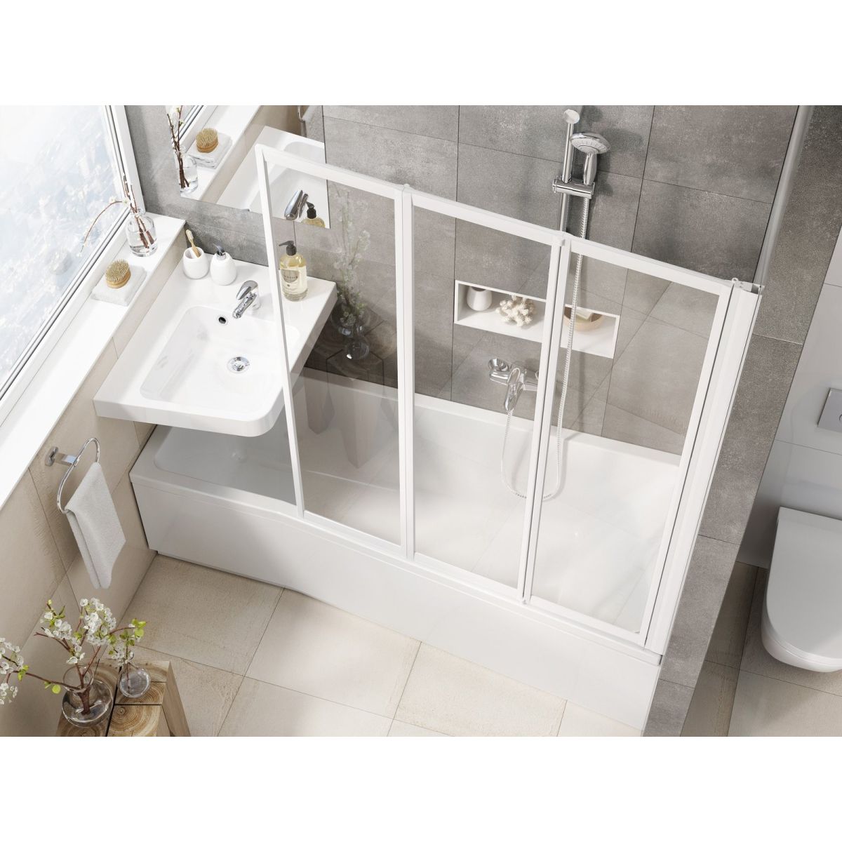 Die Badewanne bildet eine Einheit mit dem Badewannen-Duschvorhang VS3, der genau ihrer Form entspricht. Dieser dreifach faltbare Vorhang verwandelt sie in eine perfekt abgedichtete Dusche. Er lässt sich an die Wand klappen, sodass er den Innenraum nicht stört und den Einstieg in die Badewanne nicht behindert.