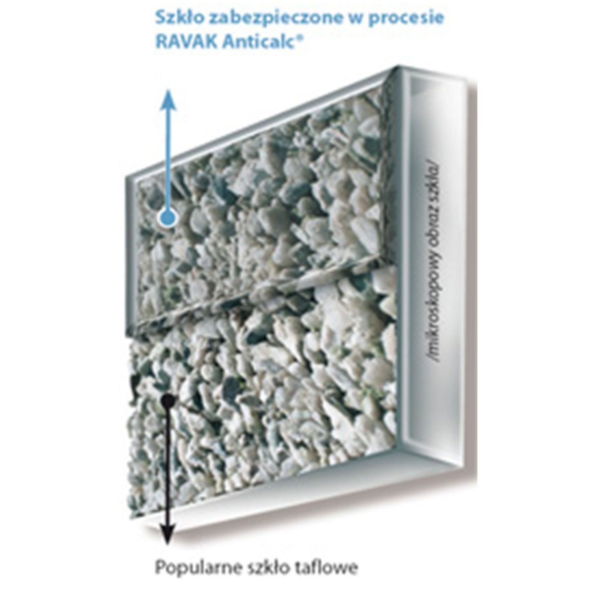 - Ravak AntiCalc® bildet auf dem Glas eine unsichtbare Beschichtung, die Wasser abweist und das Glas vor dauerhaften Verschmutzungen schützt