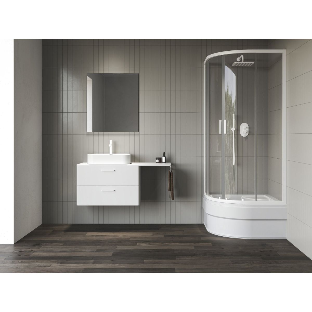 Die abgesenkte halbrunde Duschkabine Blix II ist nur 1800 mm hoch und für die Montage auf einer tiefen Duschwanne mit Sitz Sabina vorgesehen. Bei Platzmangel ist diese Kombination eine platzsparende Lösung sowohl zum Baden als auch zum Duschen. Die 27 cm tiefe Acryl-Duschwanne mit bequemem Sitz bietet ausreichend Platz, beispielsweise zum Baden von Kindern. Die Duschkabine Blix II bietet technische Perfektion und modernes Design. Montage in einer fertigen Ecke des Badezimmers auf einer tiefen Duschwanne Sabina.