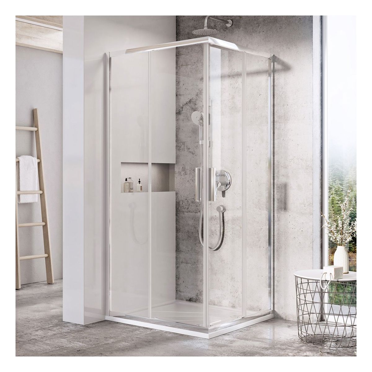 Die Kombination der Duschtüren BLSRV2K + BLSRV2K ermöglicht die Zusammenstellung einer Eckduschkabine mit breitem Eckzugang.