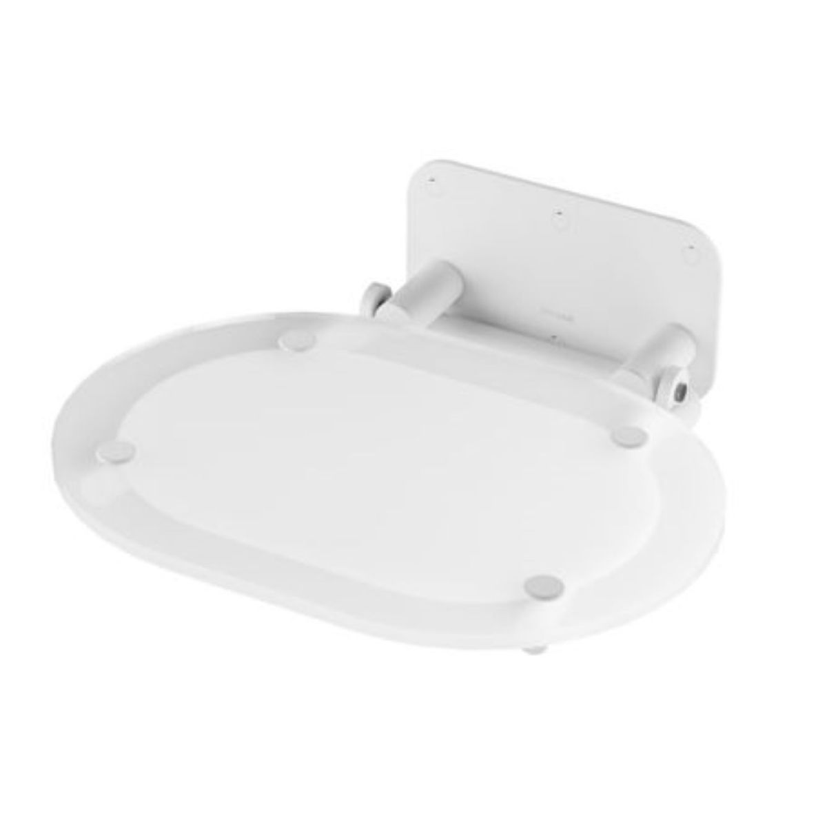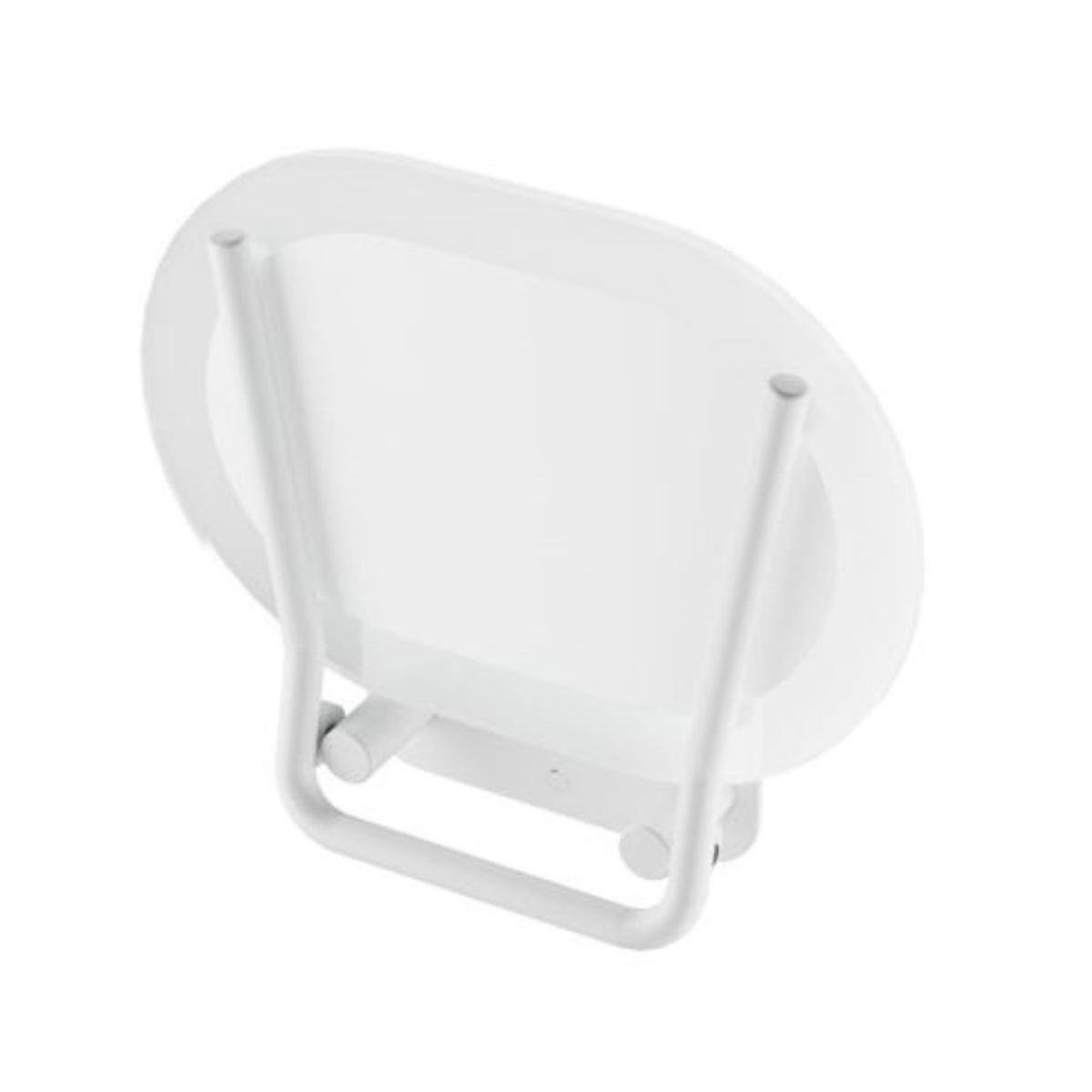 Klappbarer Duschsitz Chrome. Weiße Konstruktion mit transparentem und weißem Sitz Clear. Ovale Form.