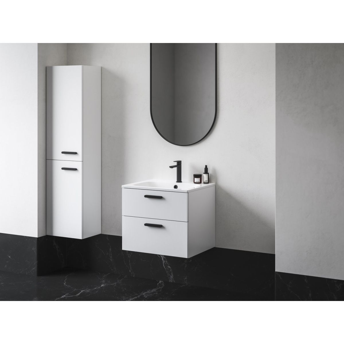 Damit Sie im Badezimmer nichts ablenkt, haben wir die Türen der hohen Schränke mit Schließdämpfern und die Schubladen mit einem automatischen Schließsystem mit sanftem Einzug ausgestattet. Sie lassen sich mit dünnen Metallgriffen in drei Farben Ihrer Wahl öffnen.