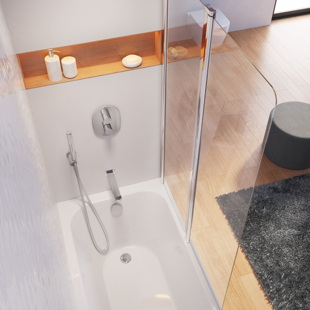 Die Badewanne ist für die Montage einer Verkleidung vorgesehen. Bevorzugen Sie eine schnelle und einfache Lösung? Wählen Sie eine Acrylverkleidung. Die Installation dauert nur wenige Minuten, und der Raum unter der Badewanne bleibt weiterhin leicht zugänglich.