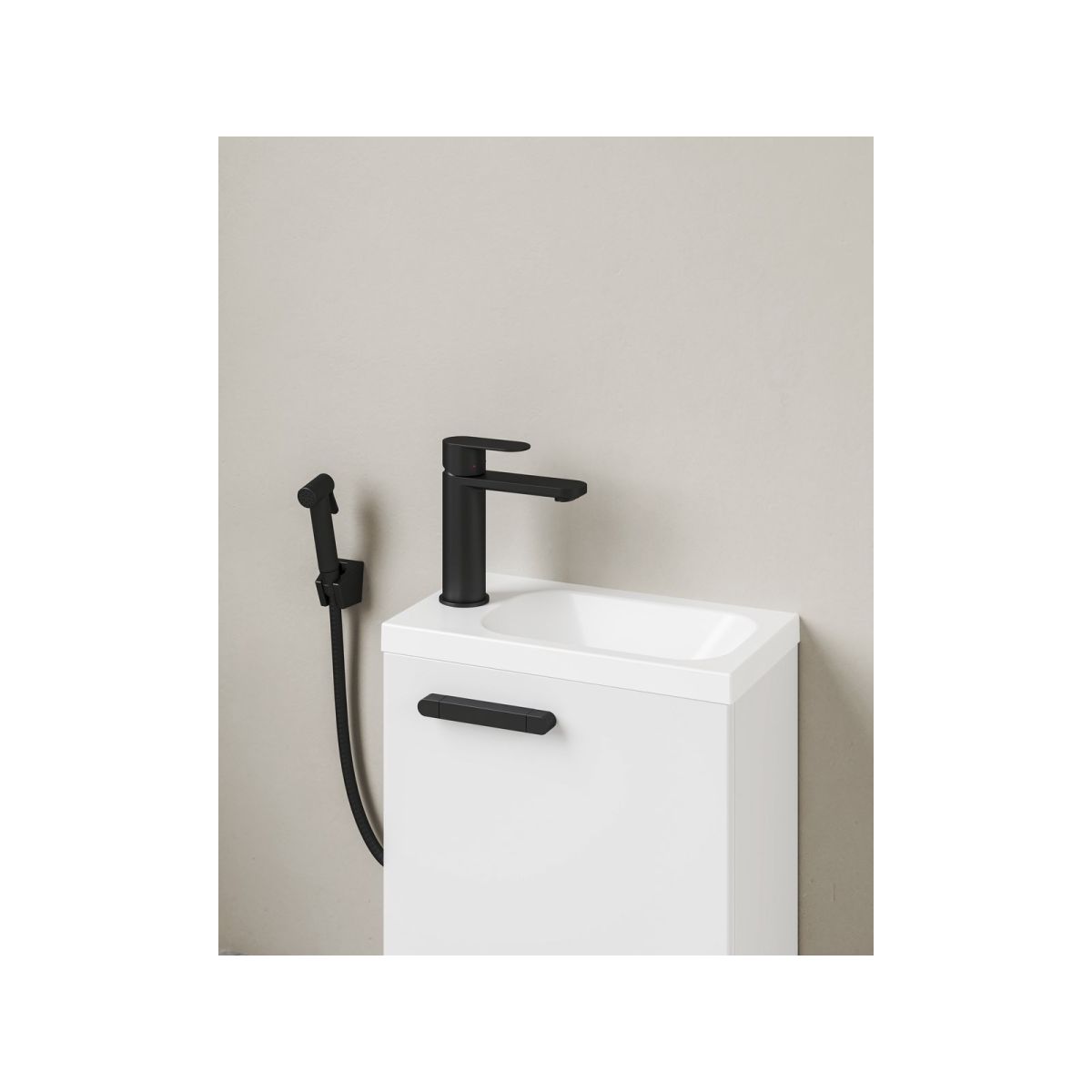 Korpus des Waschbeckenschranks SD Chrome II 40. In Weiß. Mit schwarzem Griff im Set.