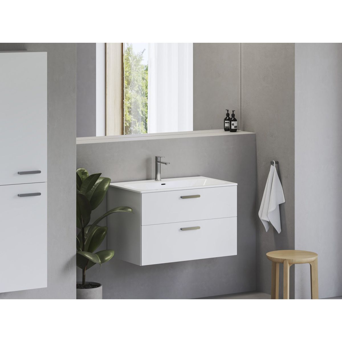 Das Waschbecken Chrome passt zu den Hängeschränken derselben Serie. Die Schränke bieten zusätzlichen Stauraum in praktischen Schubladen.