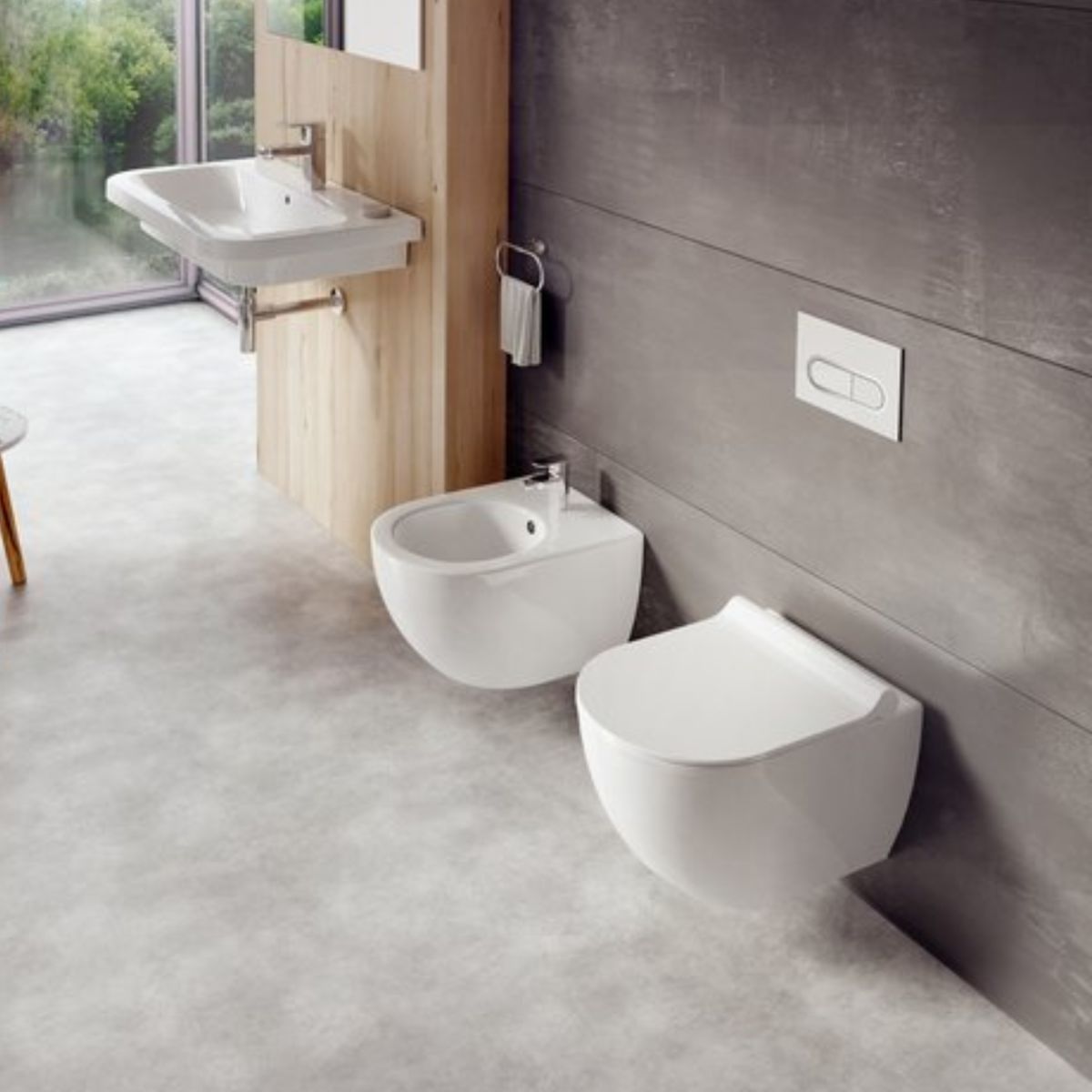 Hochwertiges Keramikmaterial in frischem und durchdachtem Design. Die Rim-Technologie sorgt dank eines speziell geformten Randes für eine perfekte Spülung mit weniger Wasser. Die Toilettenschüssel ist für die Wandmontage vorgesehen.