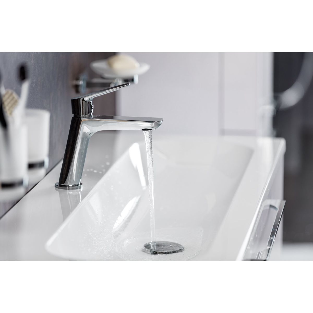 Die Waschtischarmatur verfügt über die EasyClean-Funktion. Fahren Sie mit dem Finger über das Perlatorgitter, um Kalkablagerungen zu lösen. Anschließend werden diese durch einen Wasserstrahl entfernt. Fertig.