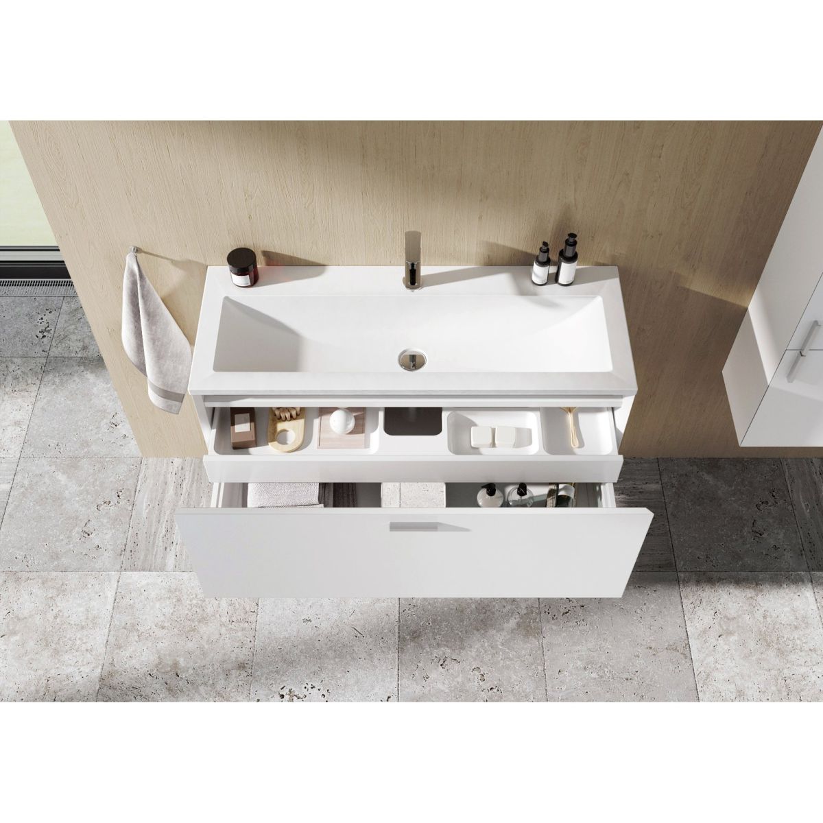 Damit Sie im Badezimmer nichts ablenkt, haben wir die Türen der hohen Schränke mit Dämpfern und die Schublade mit einem automatischen Schließsystem mit sanftem Einlauf ausgestattet.