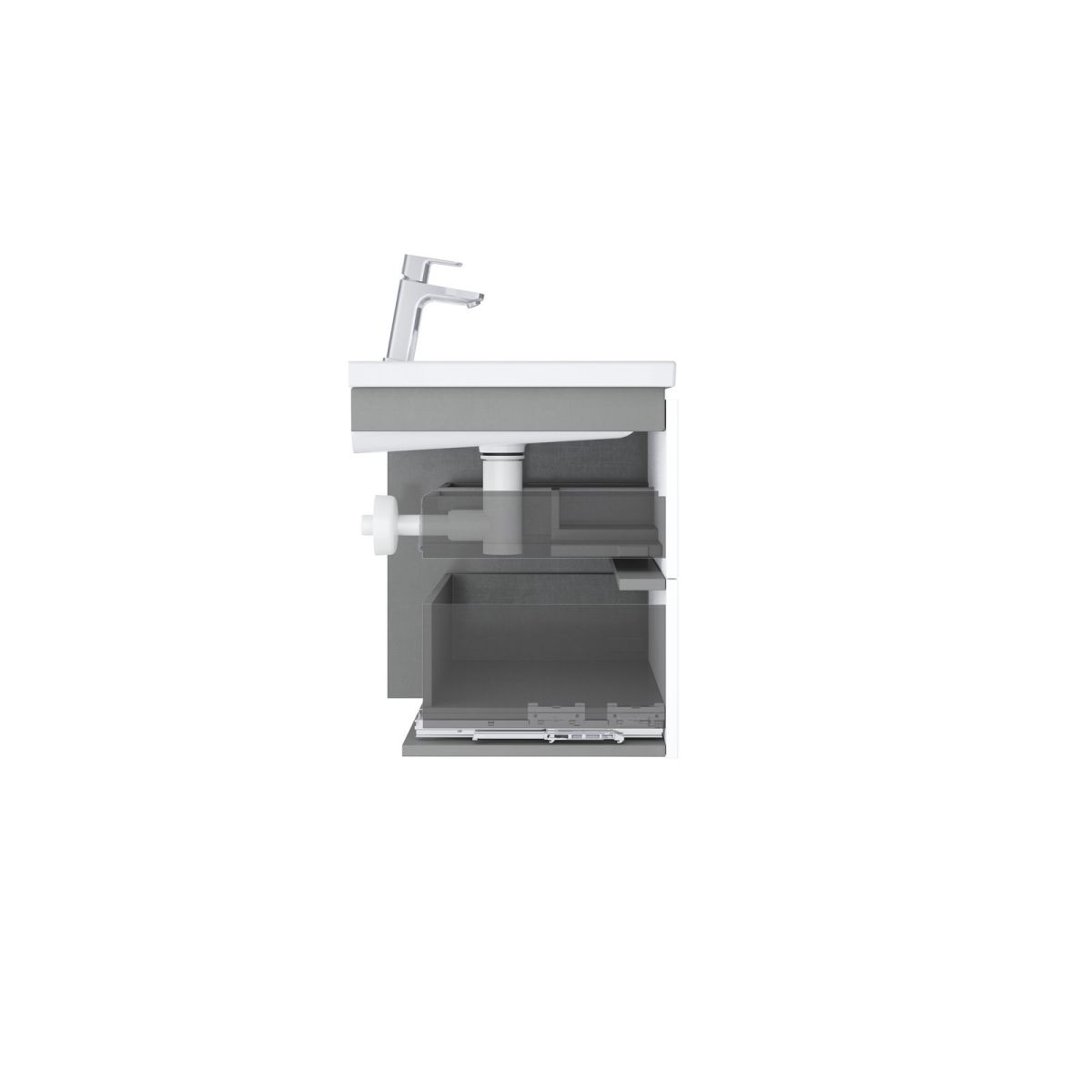 Das Innere des Schranks ist graphitfarben. Zwei Schubladen mit Soft-Close-System bieten viel Stauraum. Der Schrank hat vorgebohrte Löcher für Griffe, die nicht im Lieferumfang enthalten sind und separat erworben werden müssen (2 Stück). Es stehen drei Farben zur Auswahl: glänzendes Chrom, Schwarz oder Weiß. Der Schrank ist für das Waschbecken Comfort 60 ohne Überlauf vorgesehen. Der Schrank kann auch mit der Arbeitsplatte Comfort 60/120 in Weiß, den Konsolen für die Arbeitsplatte Balance/Comfort 120, dem weißen Handtuchhalter Comfort und einem Aufsatzwaschbecken (z. B. aus der Serie Uni / Uni Slim) kombiniert werden. Der Schrank wird zusammen mit einem Montageset (Schrauben, Scharniere, Abdeckkappen) montiert geliefert. Für die Wandmontage vorgesehen.