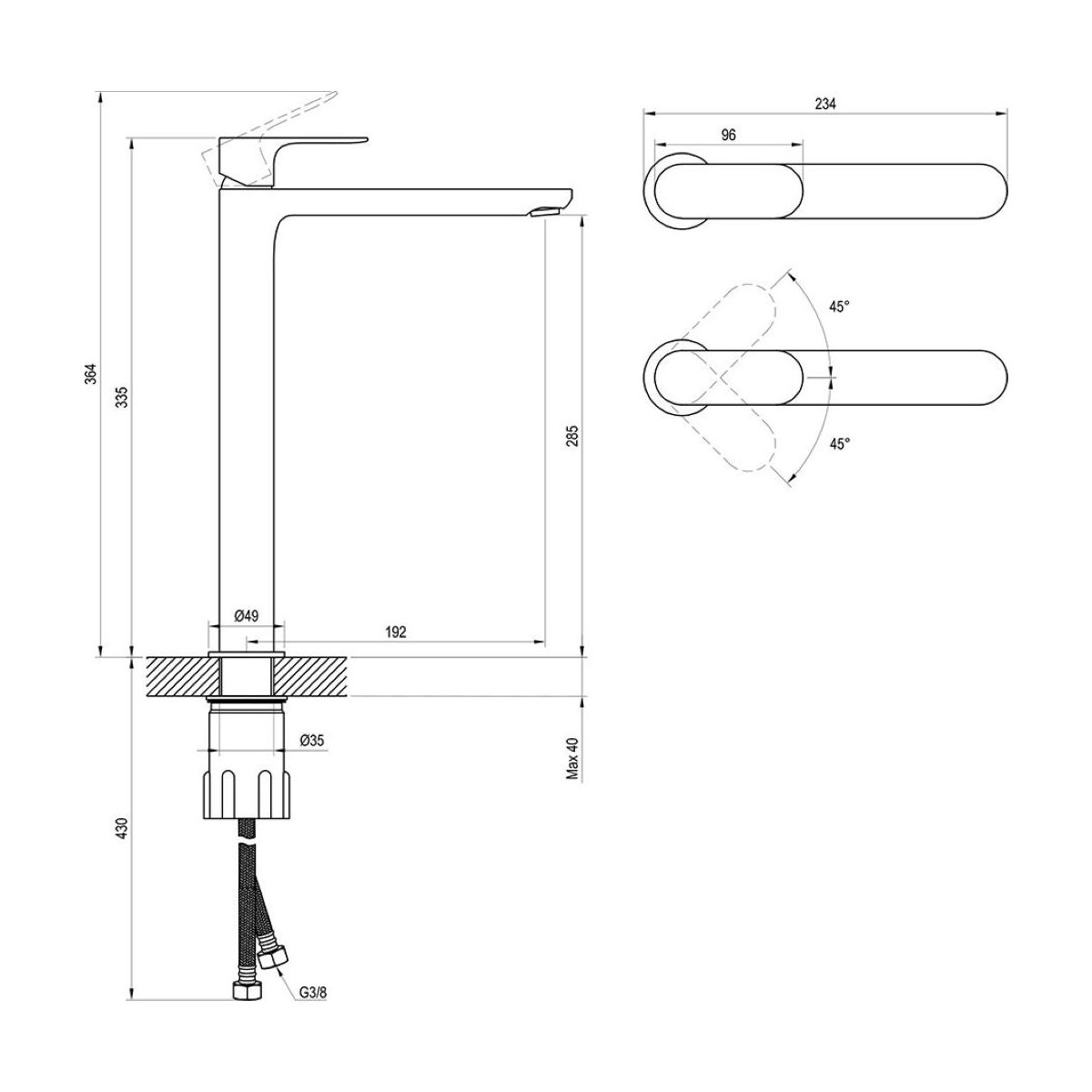 - Höhe der Armatur: 335 mm