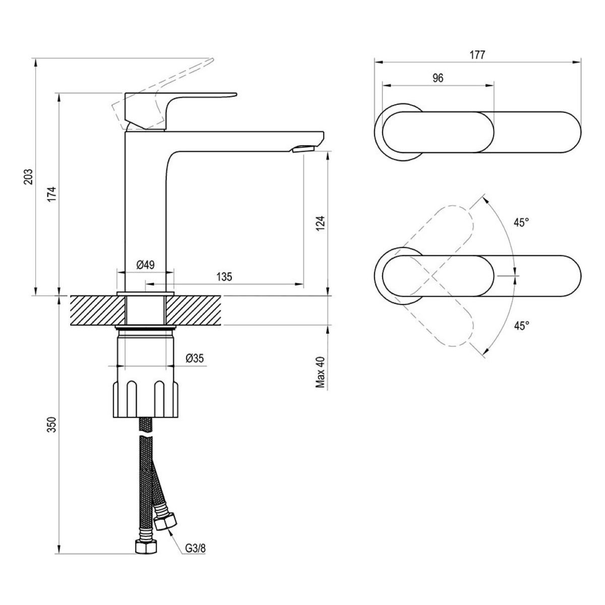 - Anschlussschläuche: flexibel 450 mm, Durchmesser DN6, G3/8