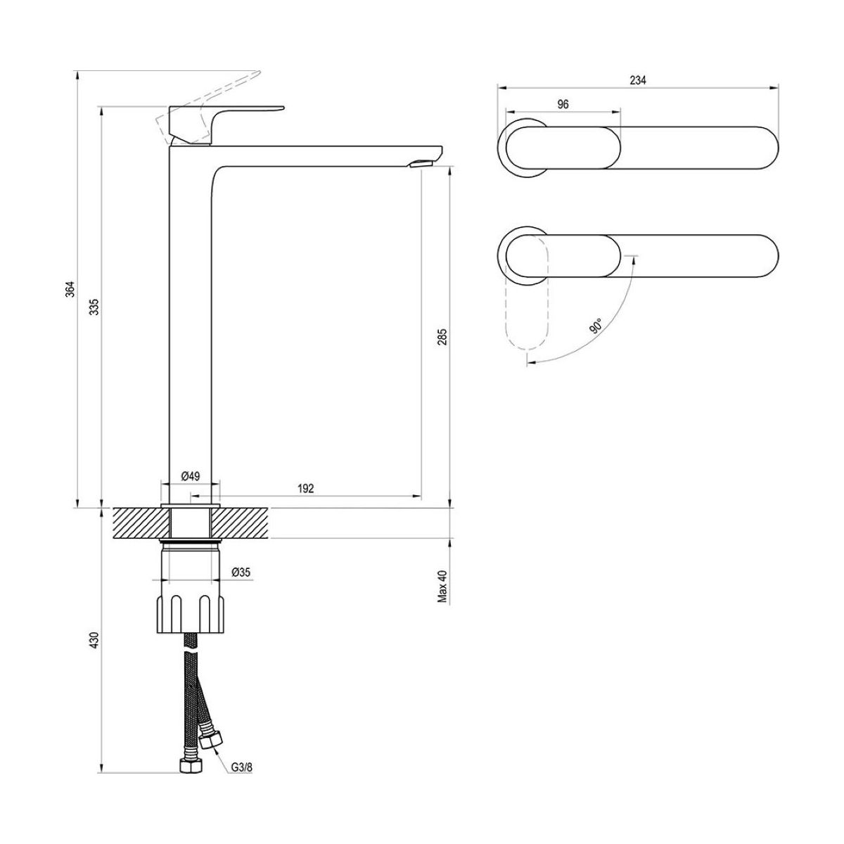 - Anschlussschläuche: flexibel 700 mm, Durchmesser DN6, G3/8