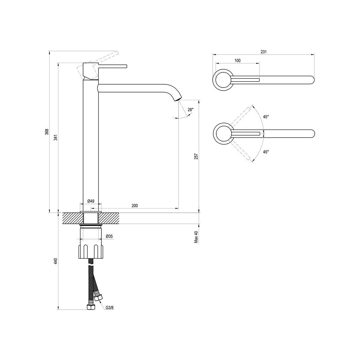 - Anschlussschläuche: flexibel 700 mm, Durchmesser DN6, G3/8