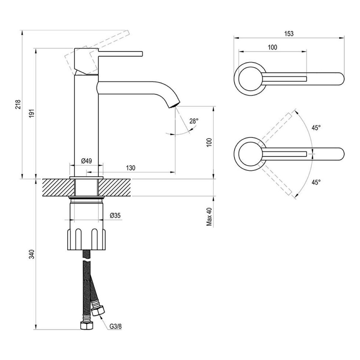 - Anschlussschläuche: flexibel 450 mm, Durchmesser DN6, G3/8
