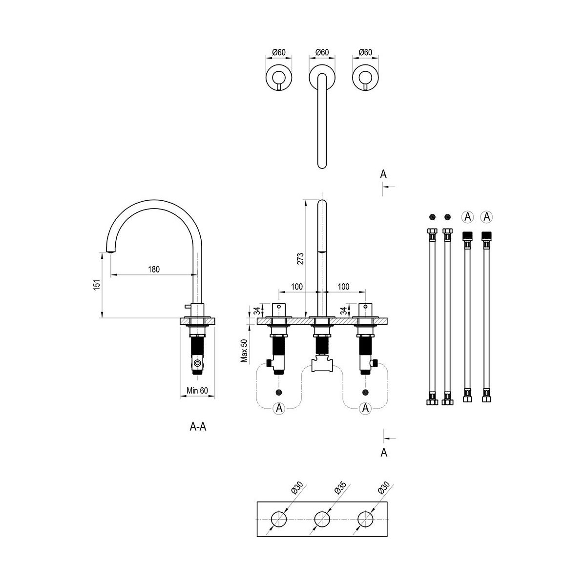 - Anschlussschläuche: flexibel 450 mm, Durchmesser DN6, G3/8