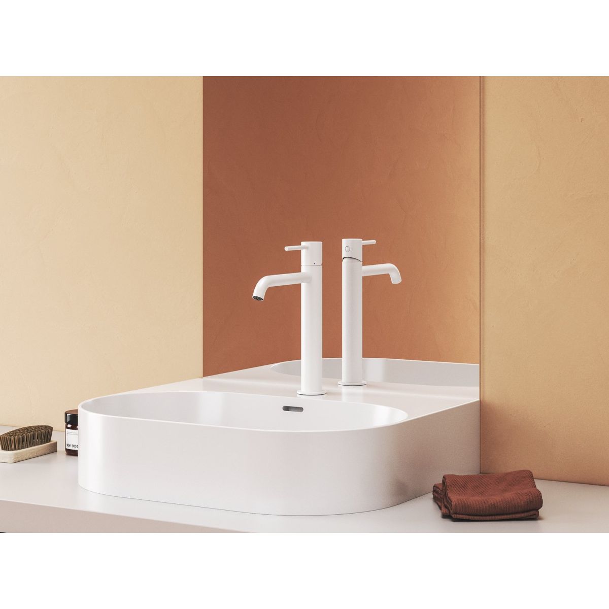 Espirit Standwaschtischarmatur, ohne Stopfen. In mattweißer Ausführung. Mit integriertem Perlator mit EcoFlow-Funktion.