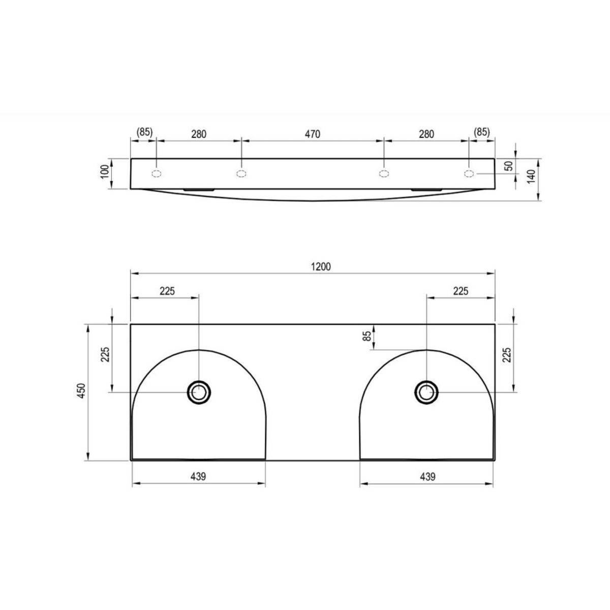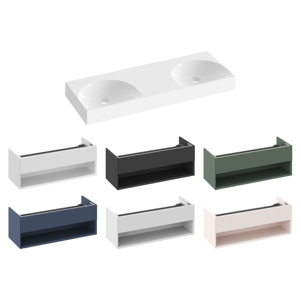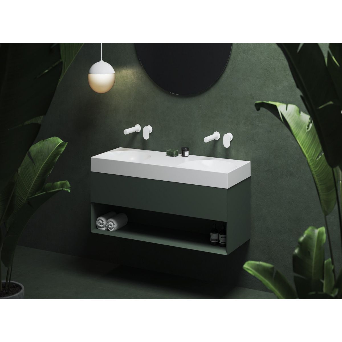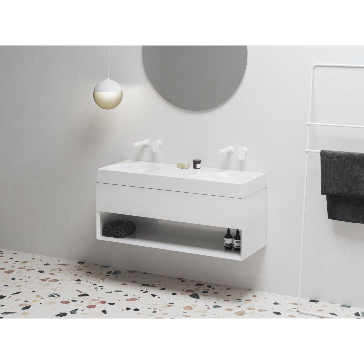 Doppelwaschbecken Lite 120 mit Stauraum. Das Waschbecken ist nicht mit einem Überlauf ausgestattet. Um ein Überlaufen zu verhindern, muss daher ein feststehender Waschbeckenständer verwendet werden. Das Waschbecken ist für die Kombination mit einer Unterputz-Waschtischarmatur vorgesehen. Im Lieferumfang ist ein Montageset (Verbindungsdübel, Schrauben usw.) enthalten. Es kann an der Wand montiert oder mit einem Waschtischunterschrank SD Lite 120 ergänzt werden.