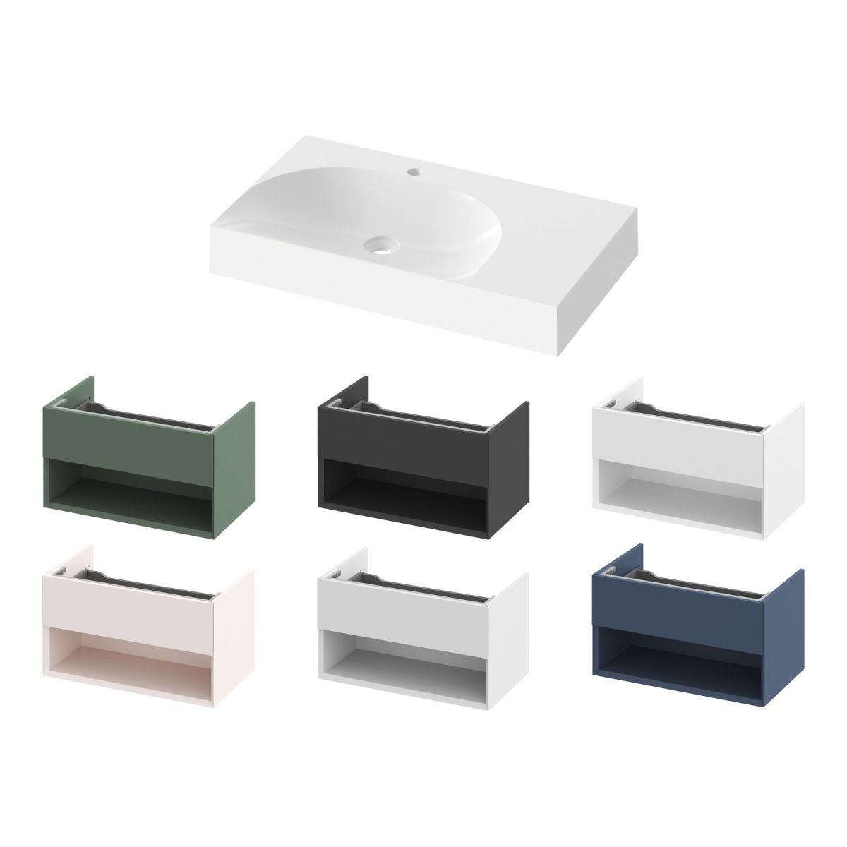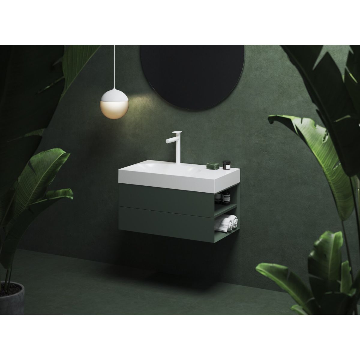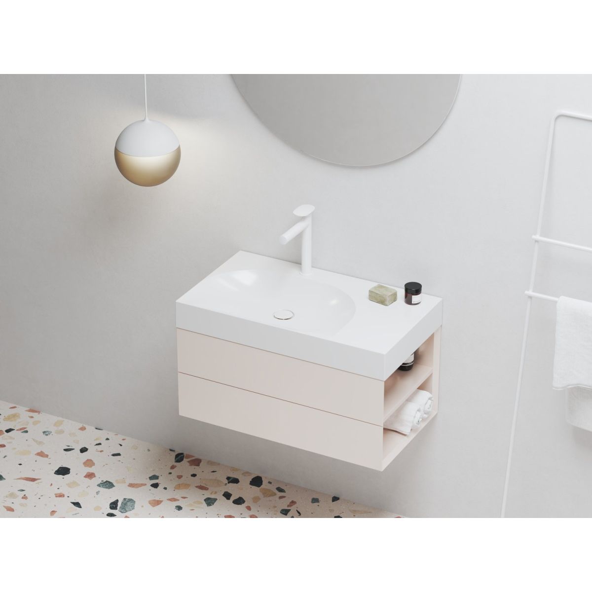 Waschbecken Lite 80/60 P mit Stauraum auf der rechten Seite. Das Waschbecken ist nicht mit einem Überlauf ausgestattet. Um ein Überlaufen zu verhindern, muss daher ein fester Waschbeckenständer verwendet werden. Das Waschbecken verfügt über eine vorgebohrte Öffnung für einen Standwaschtischmischer. Im Lieferumfang ist ein Montageset (Verbindungsdübel, Schrauben usw.) enthalten. Es kann an der Wand montiert oder mit einem Waschtischunterschrank SD Lite 80 oder SD Lite 80 P ergänzt werden.