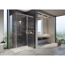 Eckduschkabine Matrix in glänzendem Chrom mit transparenter Glasfüllung und Ravak AntiCalc®-Schutzbeschichtung. Schiebeöffnungssystem. Rechte Variante.