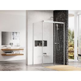Eckduschkabine Matrix in satinierter Ausführung mit transparenter Glasfüllung und Ravak AntiCalc®-Schutzschicht. Schiebeöffnungssystem. Rechte Variante.