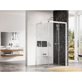 Vierteilige Eckduschkabine Matrix in Weiß mit transparenter Glasfüllung und Ravak AntiCalc®-Schutzbeschichtung. Schiebeöffnungssystem.