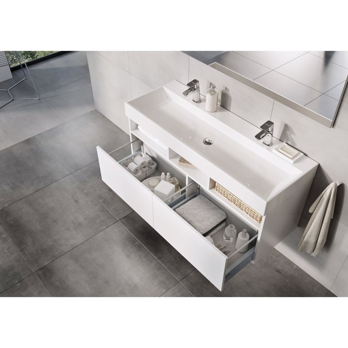 Der Waschbeckenunterschrank kombiniert Regale mit einer Schublade, in der Sie alles verstauen können, was nicht sichtbar sein soll. Kombinieren Sie ihn mit Hängeschränken, um Platz für alles zu haben, was Sie im Badezimmer griffbereit haben möchten.