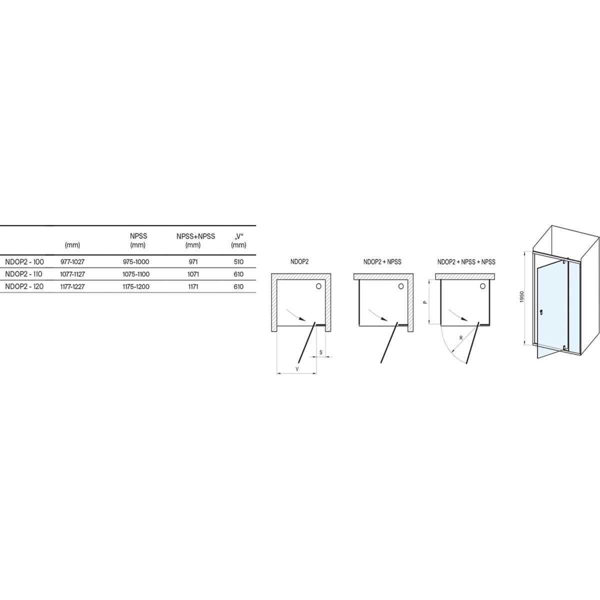 Durch die Kombination der Tür mit zwei festen Wänden vom Typ NPSS kann eine U-förmige Duschkabine geschaffen werden. Mit dem Verlängerungsprofil NNPS können die Produkte um 20 mm verlängert werden, sodass sie sich perfekt an Unebenheiten von bis zu 4 cm auf jeder Seite anpassen.