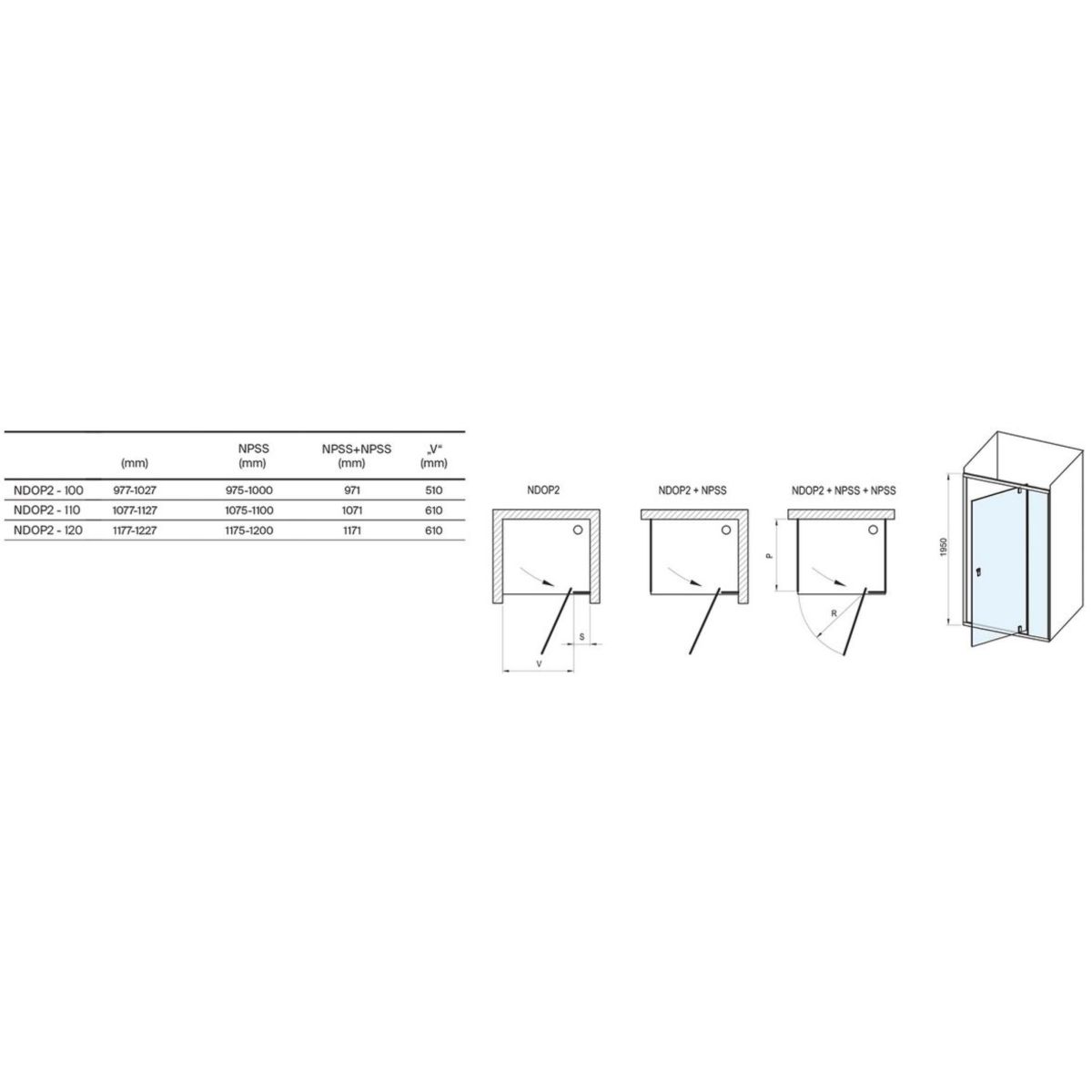 Durch die Kombination der Tür mit zwei festen Wänden vom Typ NPSS kann eine U-förmige Duschkabine geschaffen werden. Mit dem Verlängerungsprofil NNPS können die Produkte um 20 mm verlängert werden, sodass sie sich perfekt an Unebenheiten von bis zu 4 cm auf jeder Seite anpassen.