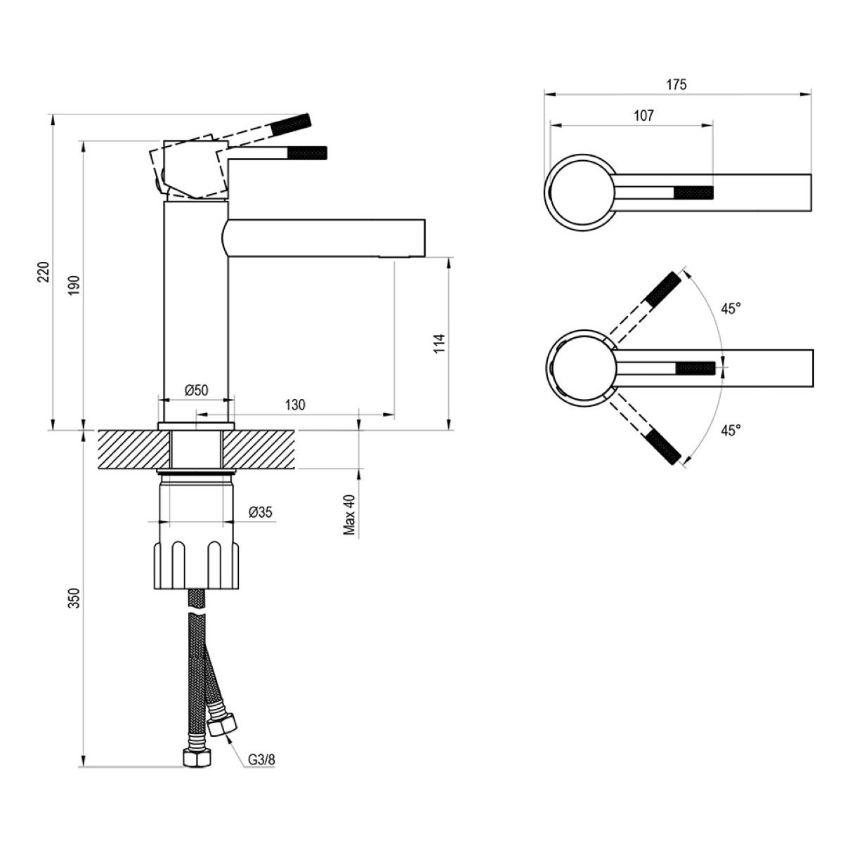 - Anschlussschläuche: flexibel 450 mm, Durchmesser G3/8