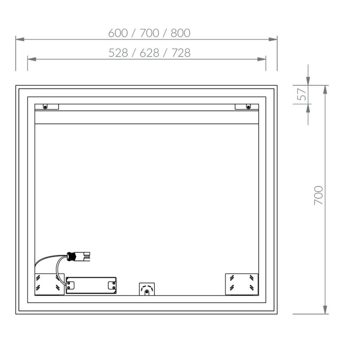 Der Spiegel ist mit einer seitlichen LED-Beleuchtung ausgestattet und für den Anschluss an eine 230-V-Stromversorgung vorbereitet. Er wird durch Aufhängen an der Wand montiert.