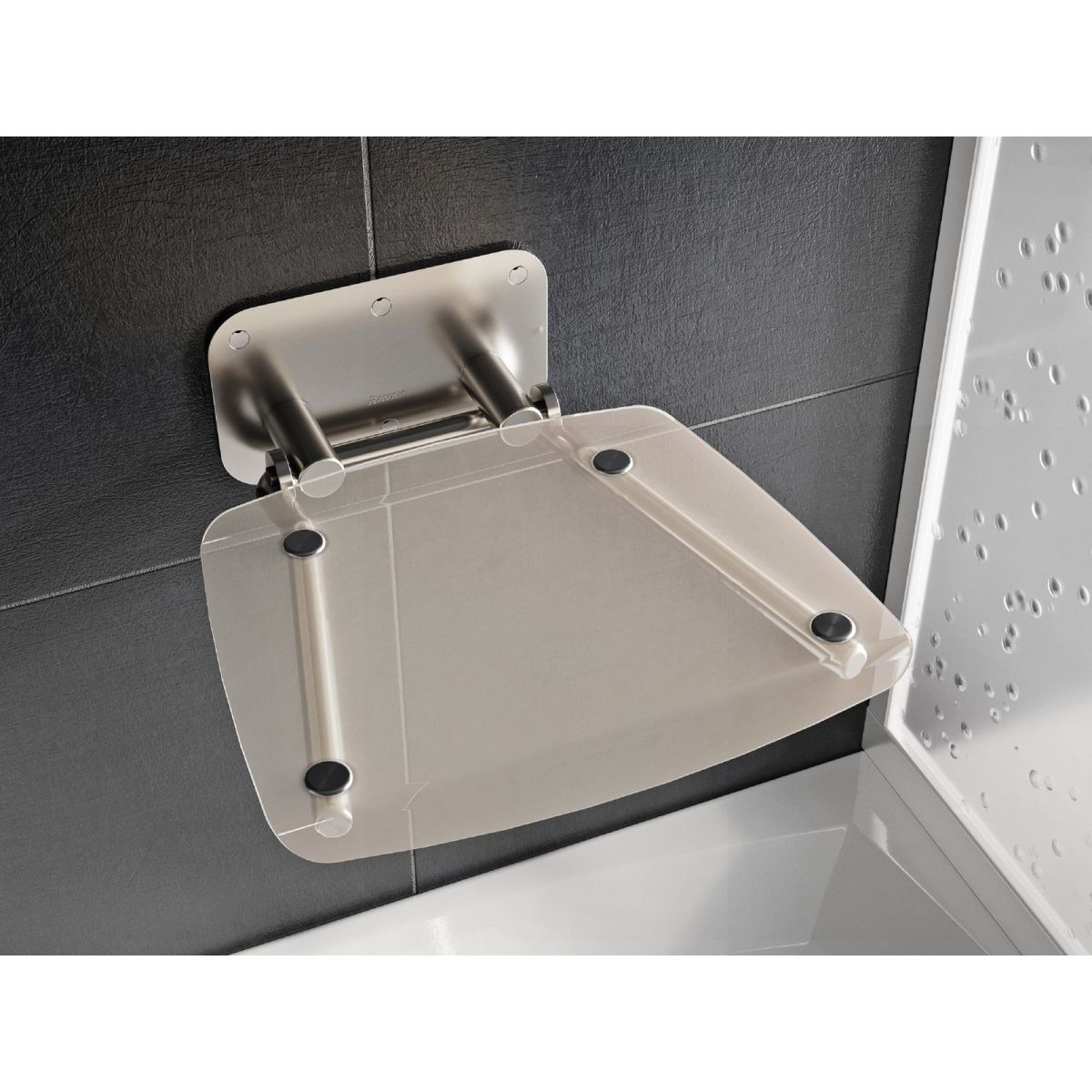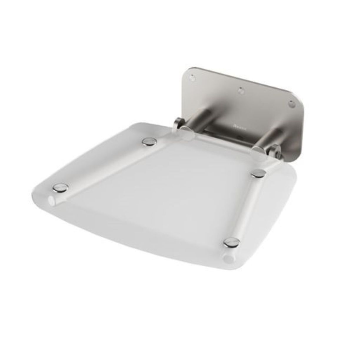 Klappbarer Duschsitz Ovo B II. Konstruktion aus Edelstahl mit transparentem Sitz Clear. Quadratische Form.