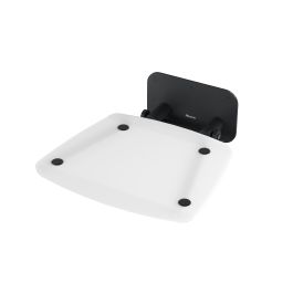 Klappbarer Duschsitz Ovo B II. Schwarze Konstruktion mit halbtransparentem, milchigem Sitz Opal. Quadratische Form.