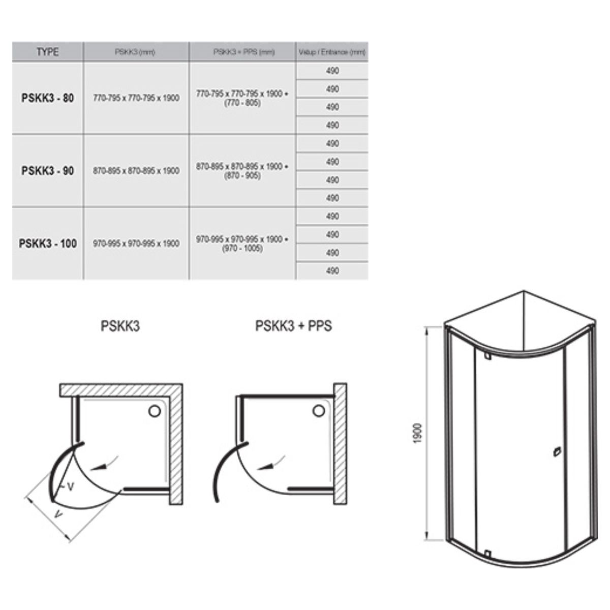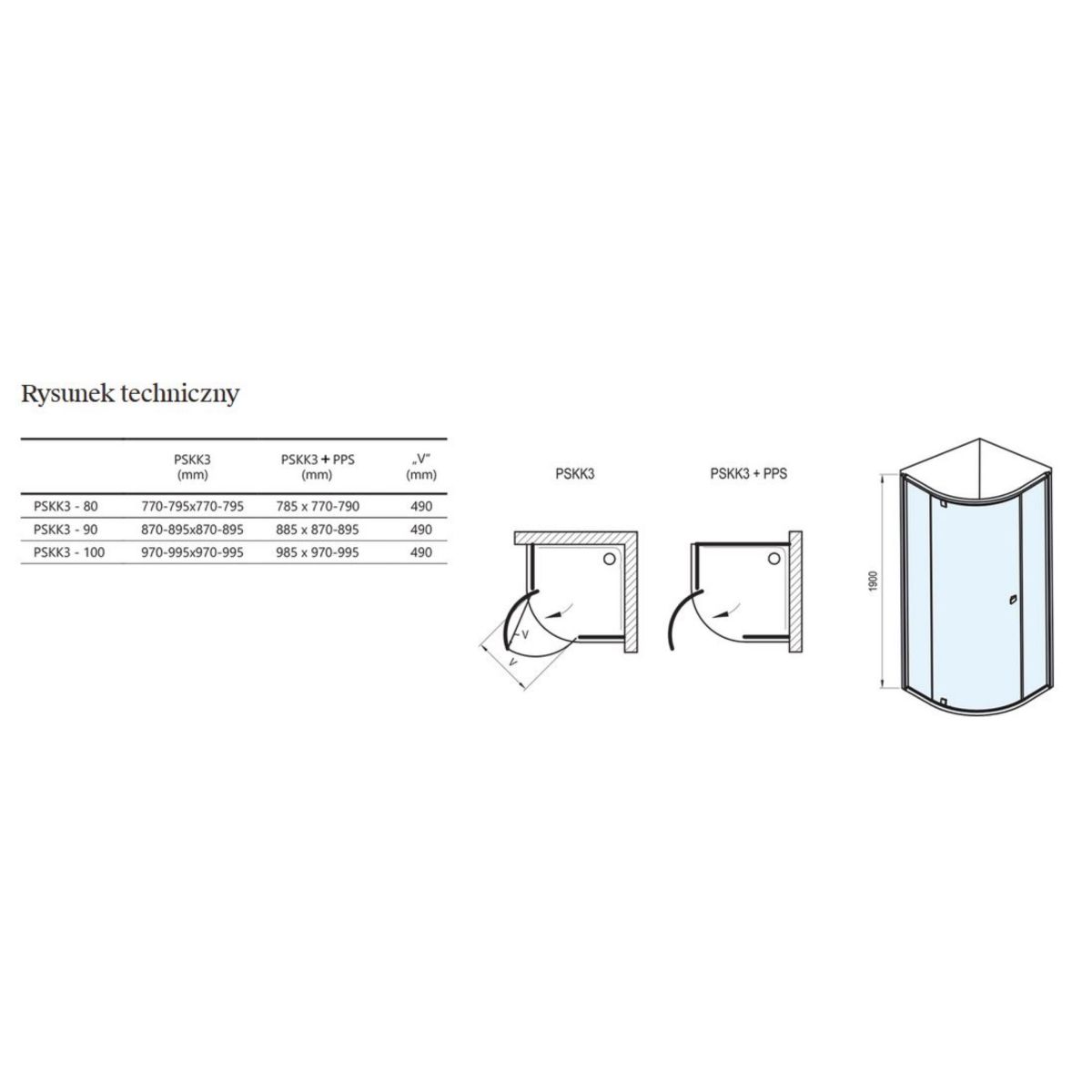 Das Produkt besteht aus zwei festen Teilen und einem Teil aus gebogenem Glas, das die Drehtür bildet. Durch Drehen des Produkts um 180° während der Montage erhalten Sie eine linke oder rechte Variante der Türöffnung. Die Montage erfolgt in einer gefliesten Ecke des Badezimmers auf Duschwannen der Marke RAVAK mit einem Radius von R – 500 mm oder direkt auf dem Boden mit eingebautem Linienablauf oder Ablaufrost. Wenn Sie keine freie Ecke im Badezimmer haben, können Sie die Kabine mit einer festen PPS-Wand ergänzen und an der Wand installieren. Mit den PNPS-Verbreiterungsprofilen kann das Produkt auf jeder Seite um bis zu 4 cm verbreitert werden.