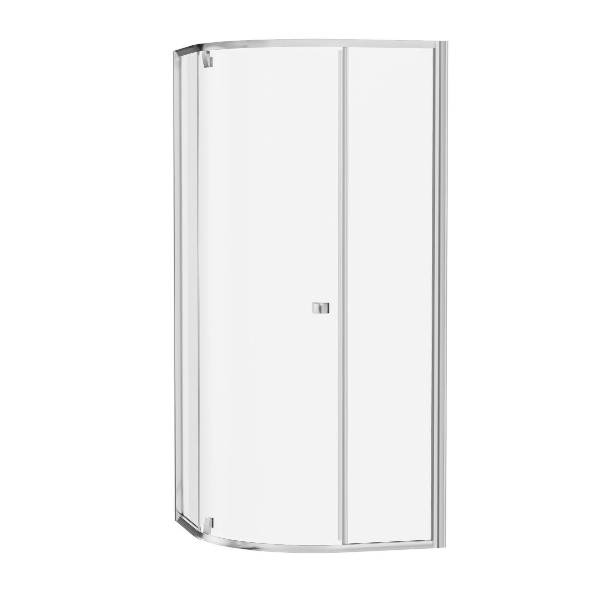 Dreiteilige halbrunde Duschkabine Pivot in Chromausführung mit transparenter Glasfüllung und Schutzschicht Ravak AntiCalc®. Öffnungssystem: Drehscharnier. Das Produkt ist nicht in einer rechten und linken Version erhältlich.