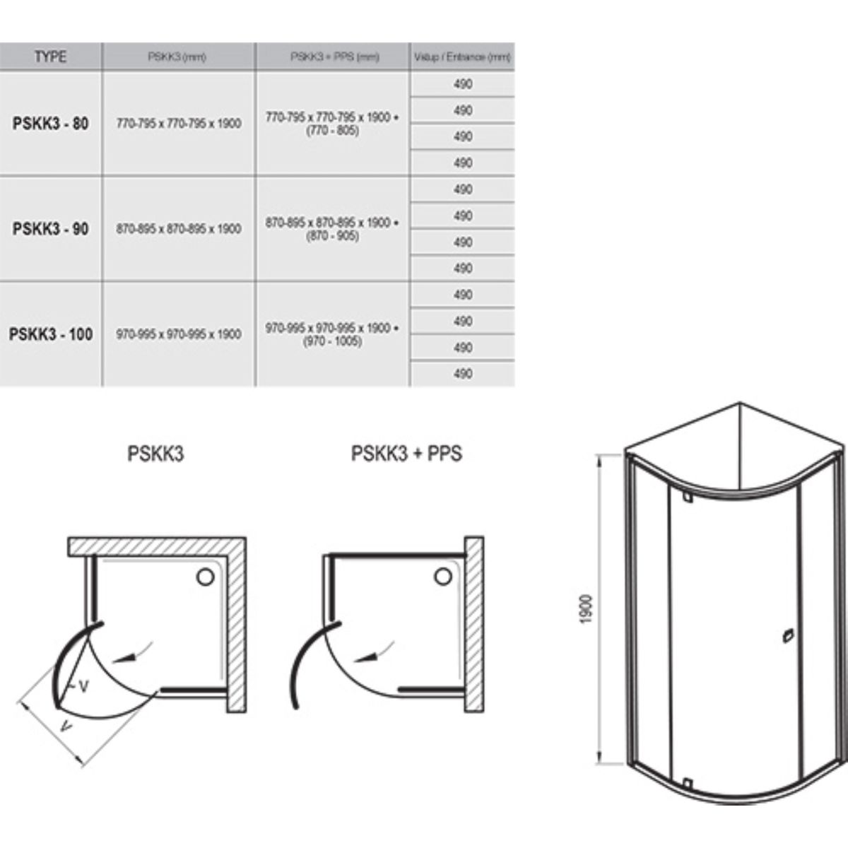 Das Produkt besteht aus zwei festen Teilen und einem Teil aus gebogenem Glas, das die Drehtür bildet. Durch Drehen des Produkts um 180° während der Montage erhalten Sie eine linke oder rechte Variante der Türöffnung. Die Montage erfolgt in einer gefliesten Ecke des Badezimmers auf Duschwannen der Marke RAVAK mit einem Radius von R – 500 mm oder direkt auf dem Boden mit eingebautem Linienablauf oder Ablaufrost. Wenn Sie keine freie Ecke im Badezimmer haben, können Sie die Kabine mit einer festen PPS-Wand ergänzen und an der Wand installieren. Mit den PNPS-Verbindungsprofilen kann das Produkt auf jeder Seite um bis zu 4 cm erweitert werden.