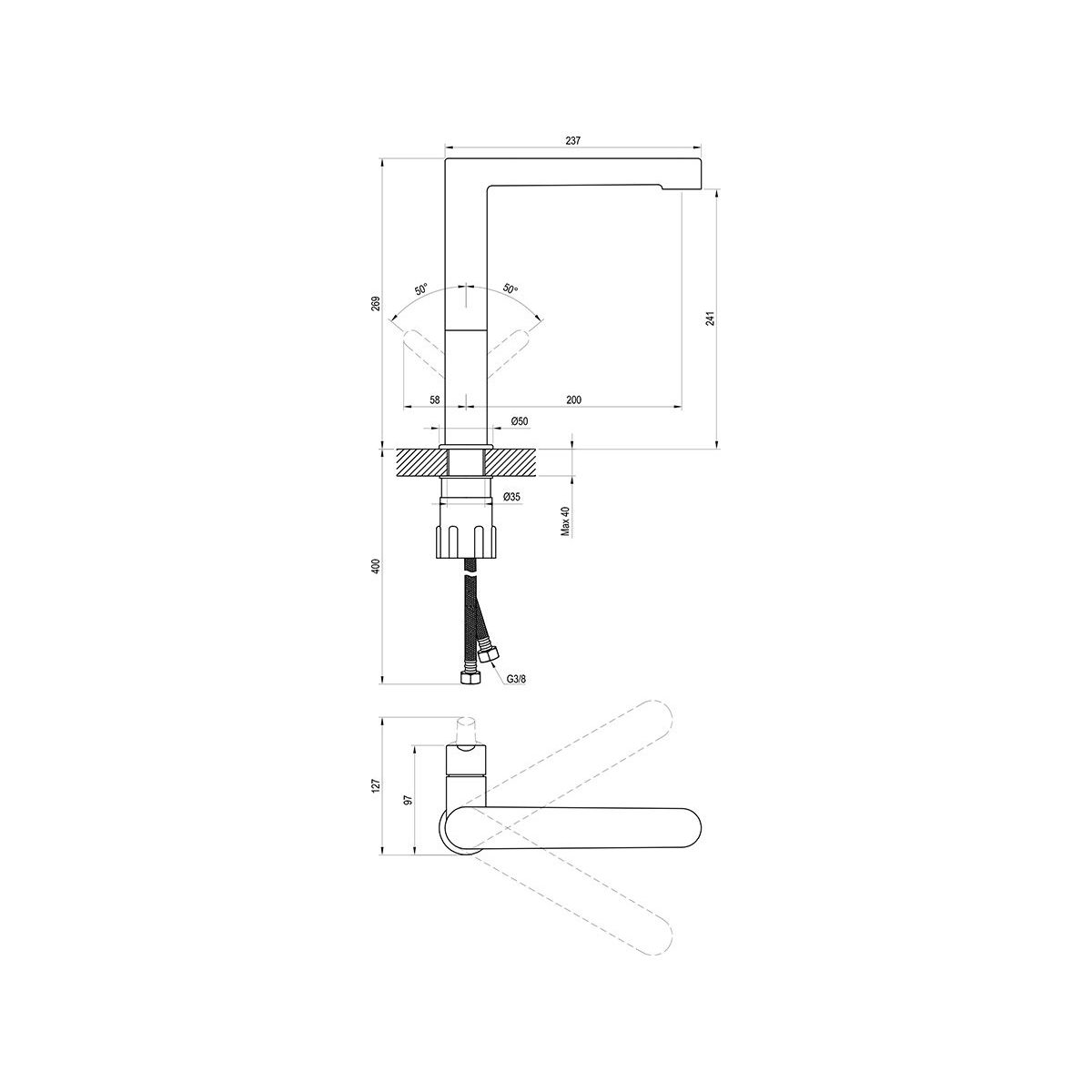 - Höhe der Armatur: 269 mm