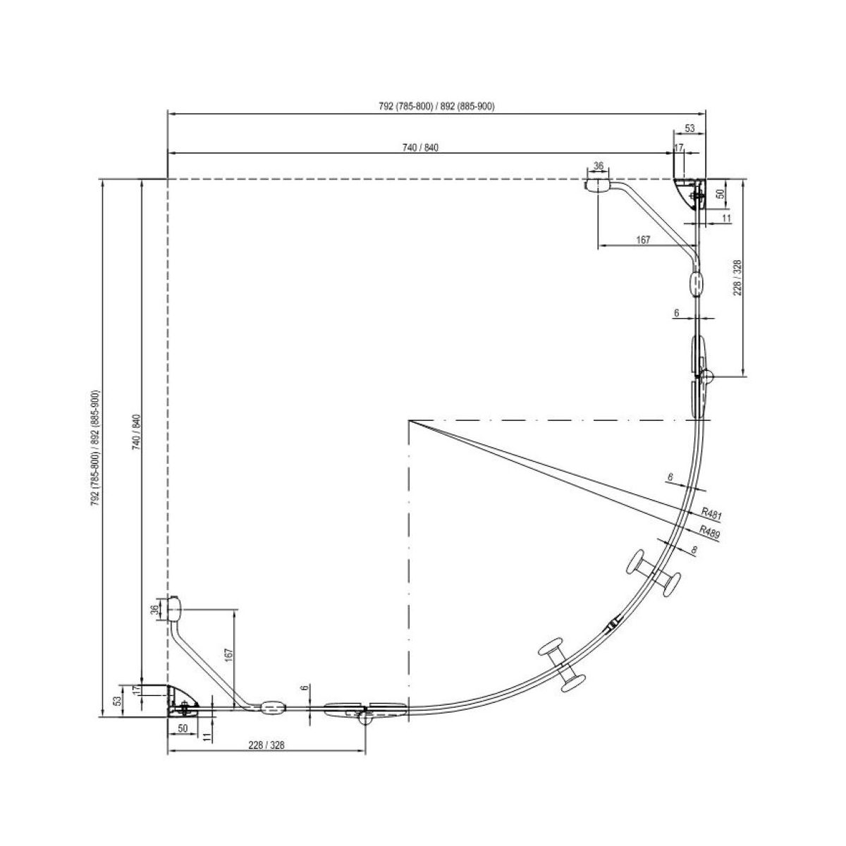 Die Kabine besteht aus zwei geraden und zwei gebogenen Elementen, die eine zu öffnende Tür bilden. Montage in einer gefliesten Ecke des Badezimmers auf einer Ravak-Duschwanne: Ronda, Ronda Basic, Elipso Pro, Elipso Pro Flat, Elipso Pro Chrome oder direkt auf dem Boden mit eingebautem Linienablauf oder Ablaufrost. Mit Hilfe eines Befestigungsprofils können Unebenheiten von bis zu 1,5 cm auf jeder Seite ausgeglichen werden. Im Lieferumfang sind zwei kurze Halterungen enthalten. Radius 500 mm.