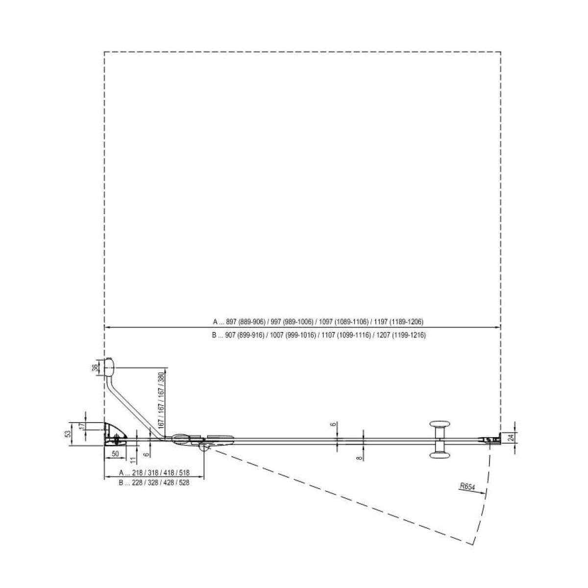 Einbau in die Nische der Ravak-Duschwanne: Angela, Perseus Pro, Perseus Pro Flat, Perseus Pro Chrome, Gigant Pro, Gigant Pro Flat, Gigant Pro Chrome oder direkt auf dem Boden mit eingebautem Linienablauf oder Ablaufrost. Die Variante B ist für eine Bauöffnung vorgesehen, die 16 mm größer ist als die Standardgröße des Produkts. Für die Verbindung mit einer festen Wand empfehlen wir die Wahl einer Tür vom Typ B.