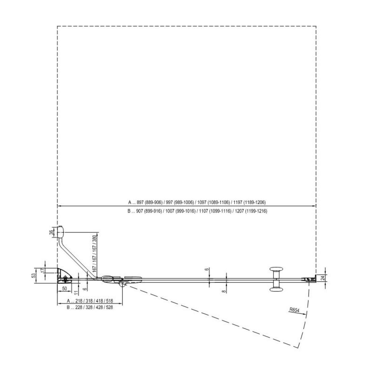 Einbau in die Aussparung der Ravak-Duschwanne: Angela, Perseus Pro, Perseus Pro Flat, Perseus Pro Chrome, Gigant Pro, Gigant Pro Flat, Gigant Pro Chrome oder direkt auf dem Boden mit eingebautem Linienablauf oder Ablaufrost. Die Variante A ist für Bauöffnungen vorgesehen, die 11 mm kleiner sind als die Standardabmessungen des Produkts. Für die Verbindung mit einer festen Wand empfehlen wir die Wahl einer Tür vom Typ B.