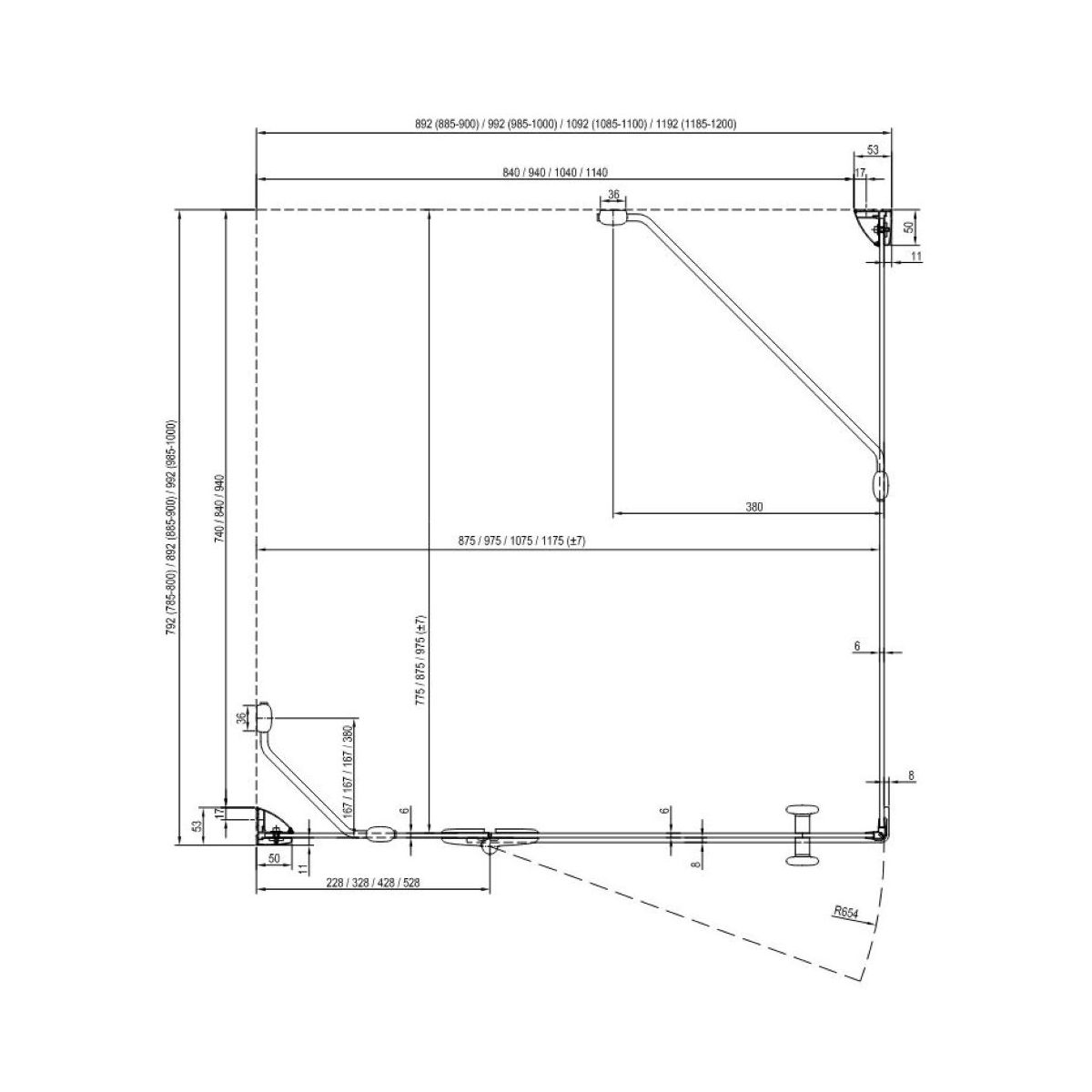 Die Wand kann selbstständig als Trennwand im Badezimmer montiert und mit der Duschtür SMSD2 verbunden werden. Für die linke Tür ist die linke feste Wand vorgesehen. Montage in einer gefliesten Ecke des Badezimmers auf einer Ravak-Duschwanne: Angela, Perseus Pro, Perseus Pro Flat, Perseus Pro Chrome, Gigant Pro, Gigant Pro Flat, Gigant Pro Chrome oder direkt auf dem Boden mit eingebautem Linienablauf oder Ablaufrost. Mit Hilfe eines Befestigungsprofils können Unebenheiten von bis zu 1,5 cm auf jeder Seite ausgeglichen werden.