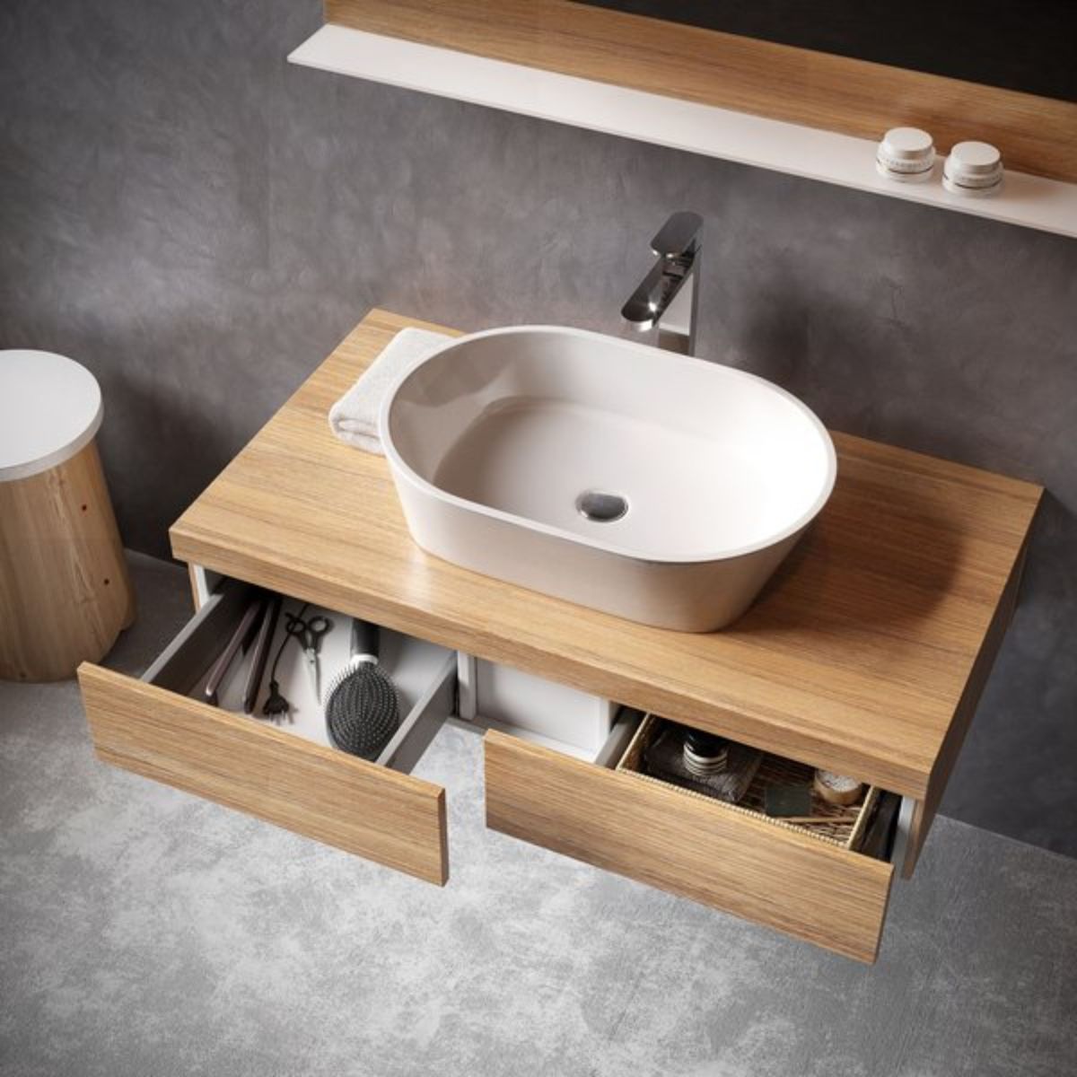 Dieses Waschbecken ist für die Aufsatzmontage vorgesehen. Solo kann auch auf einem Schrank montiert werden, der zusätzlichen Stauraum in praktischen Schubladen bietet.